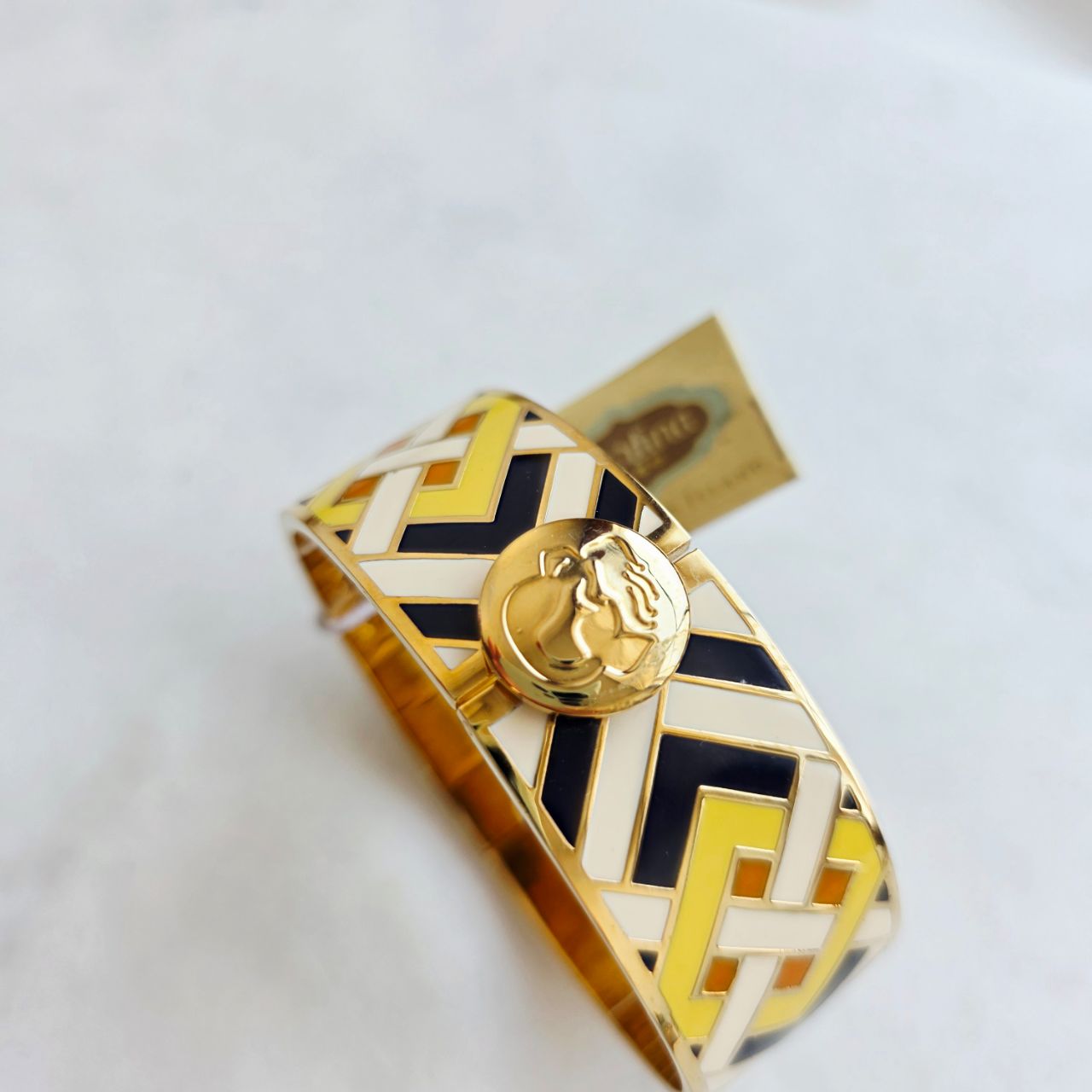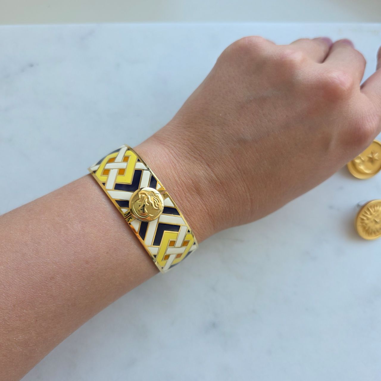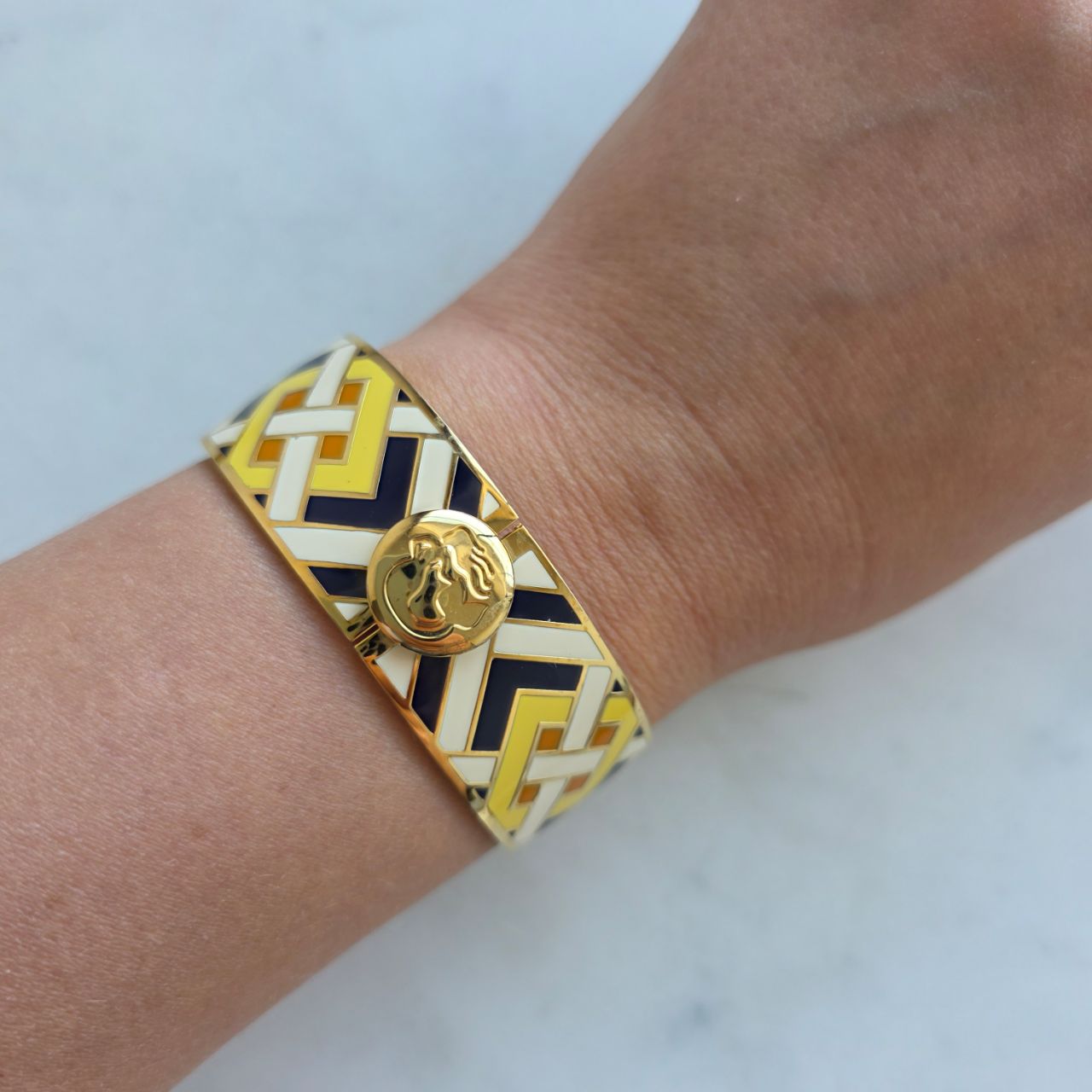 Шикарный браслет с фантазийным орнаментом выполнен в желтом, кремовом и графитовым цвете. На запястье браслет выглядит очень декоративно.