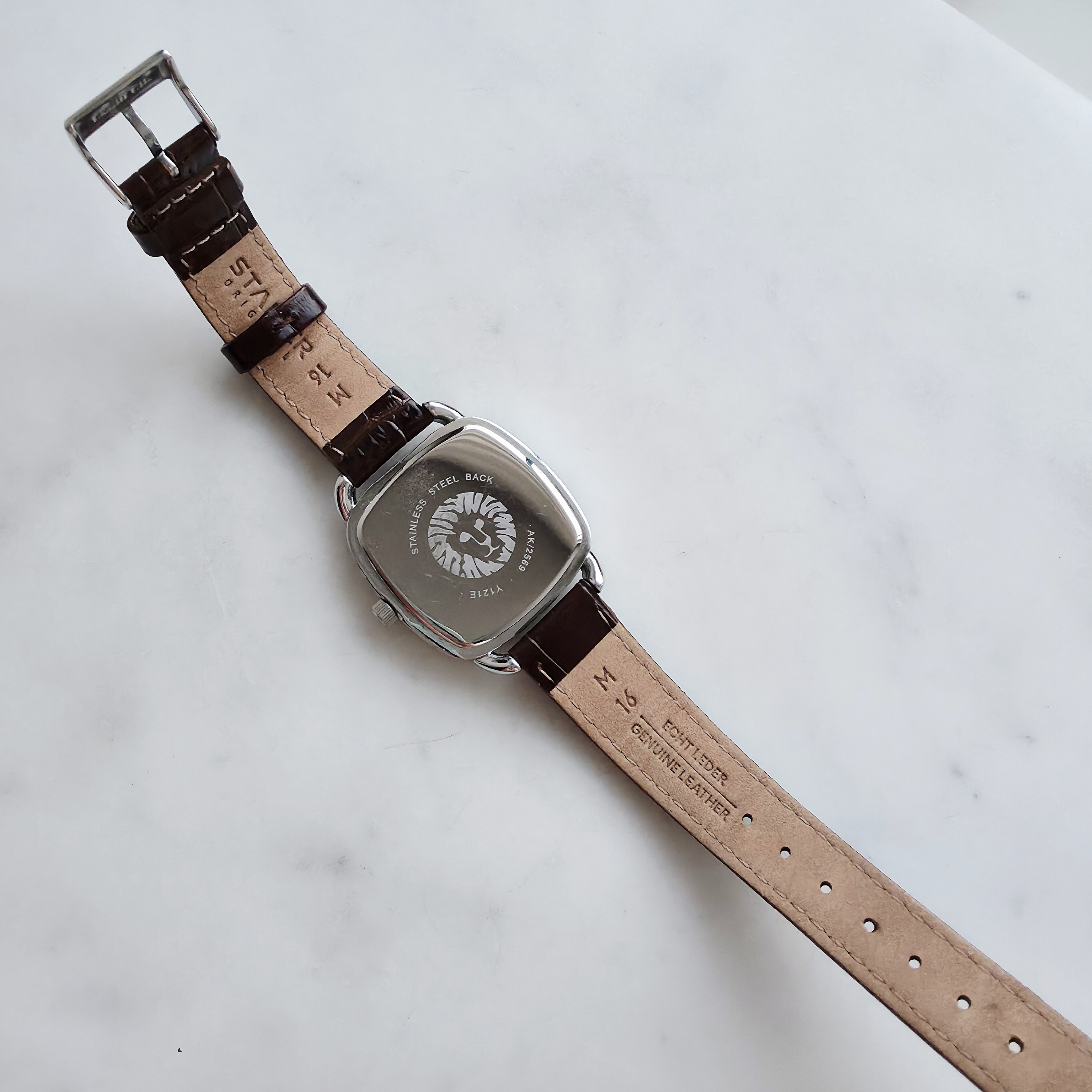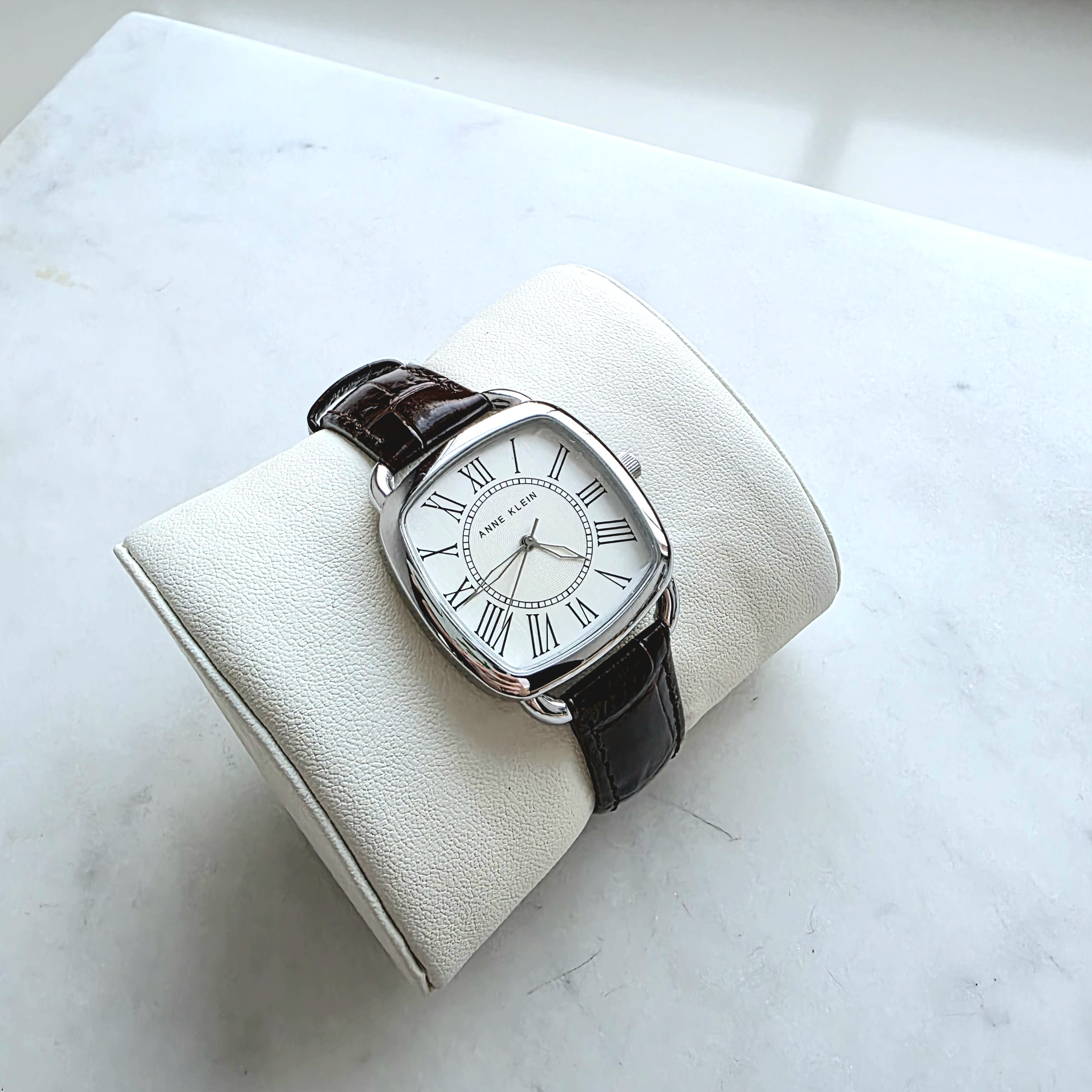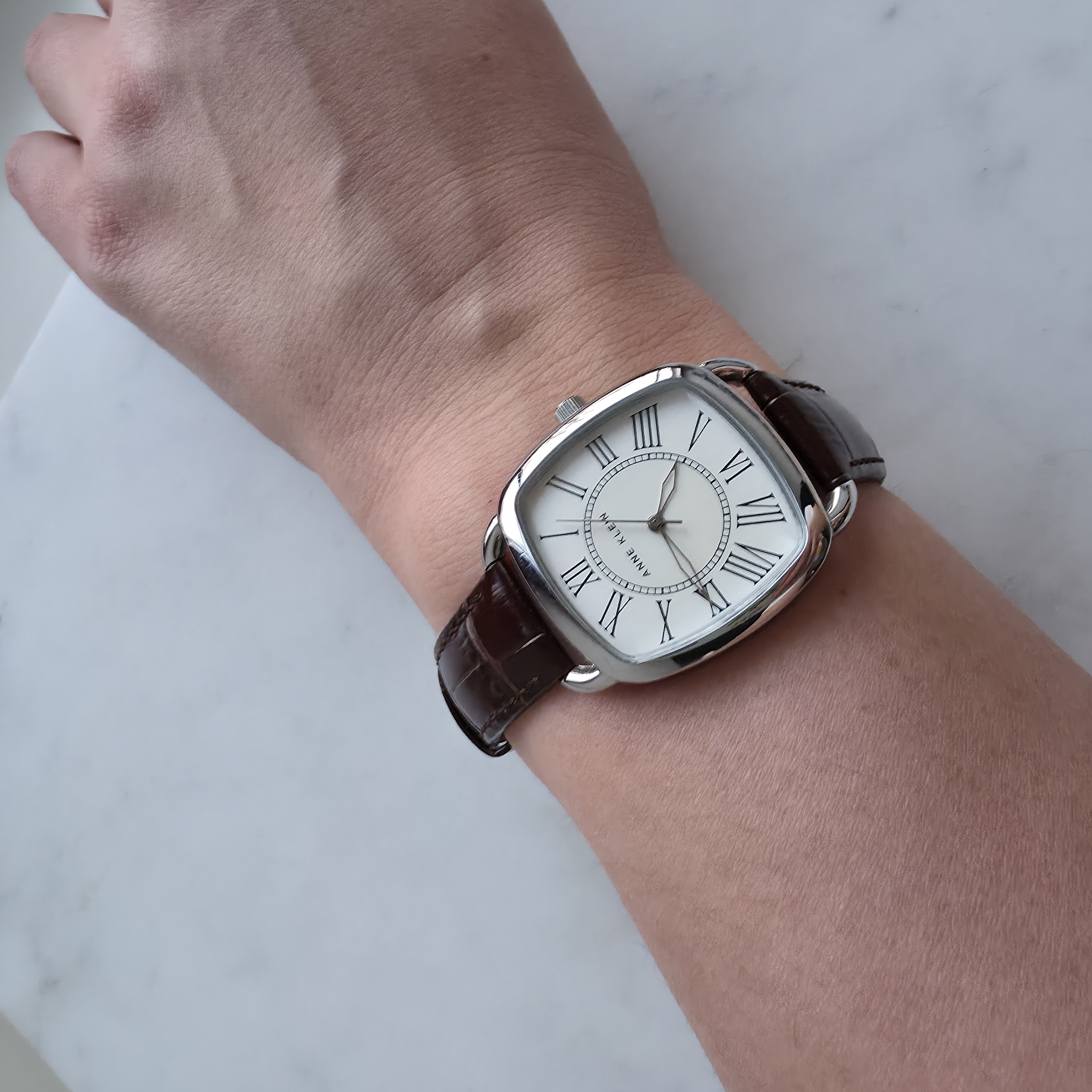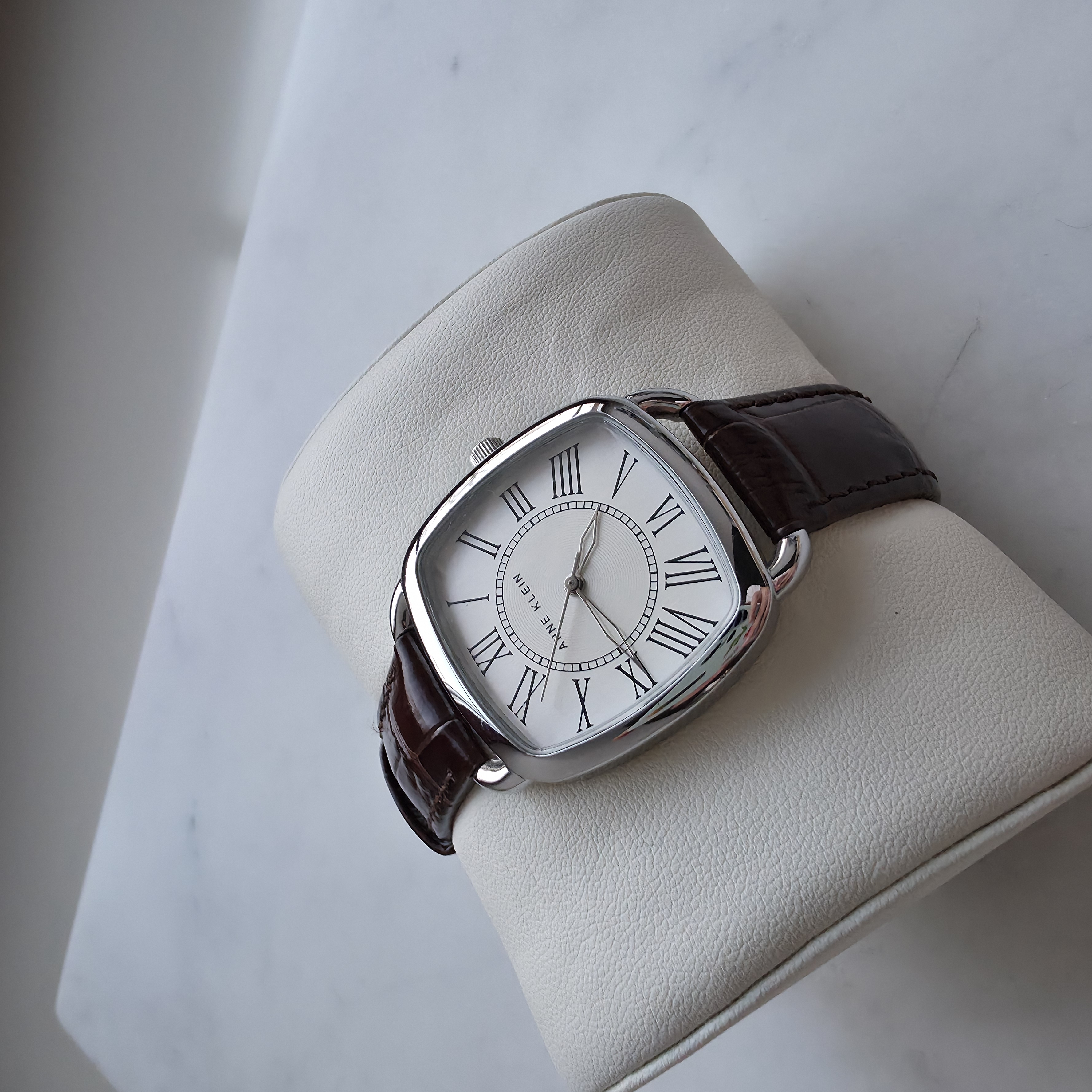 Крупные часы на кожаном ремешке коричневого цвета шикарно смотрятся на запястье. Часы выполнены в светлом металле, циферблат оформлен римскими цифрами.