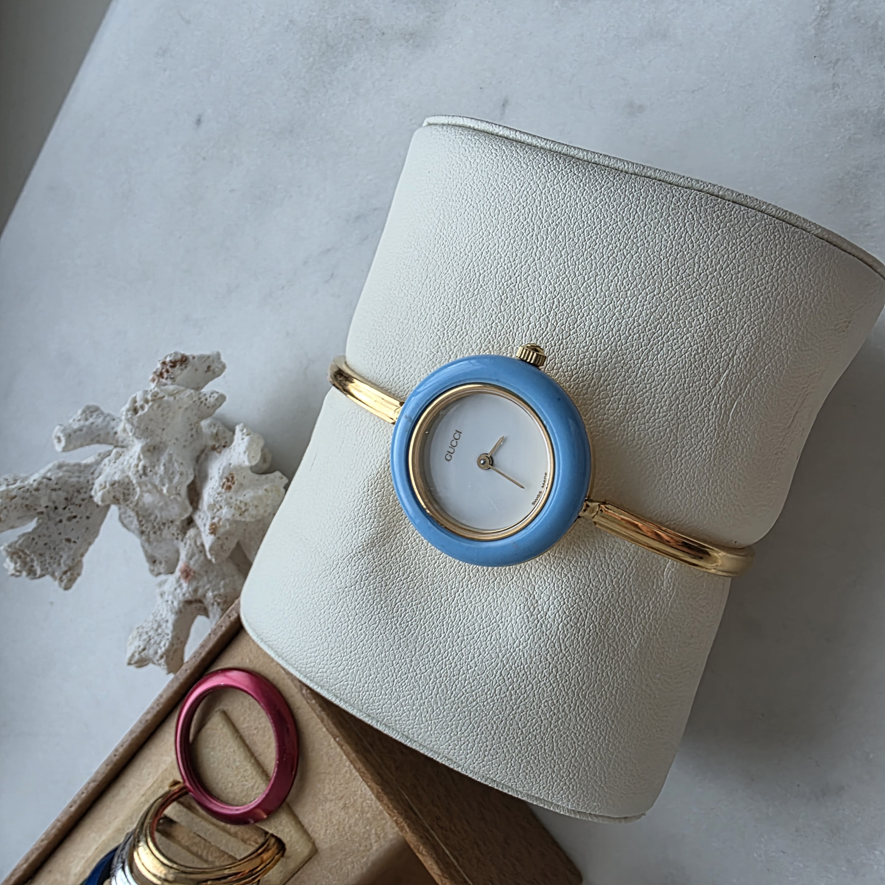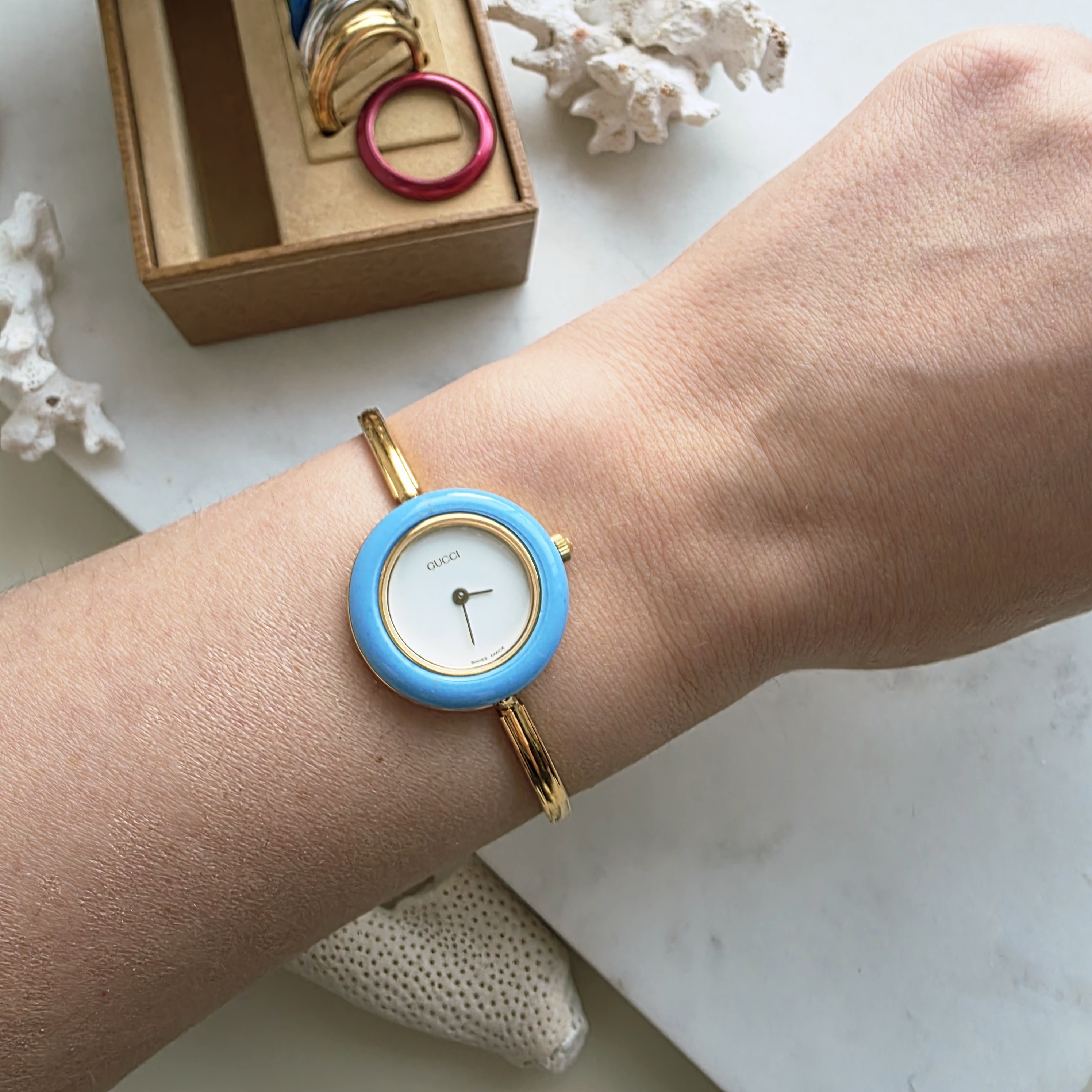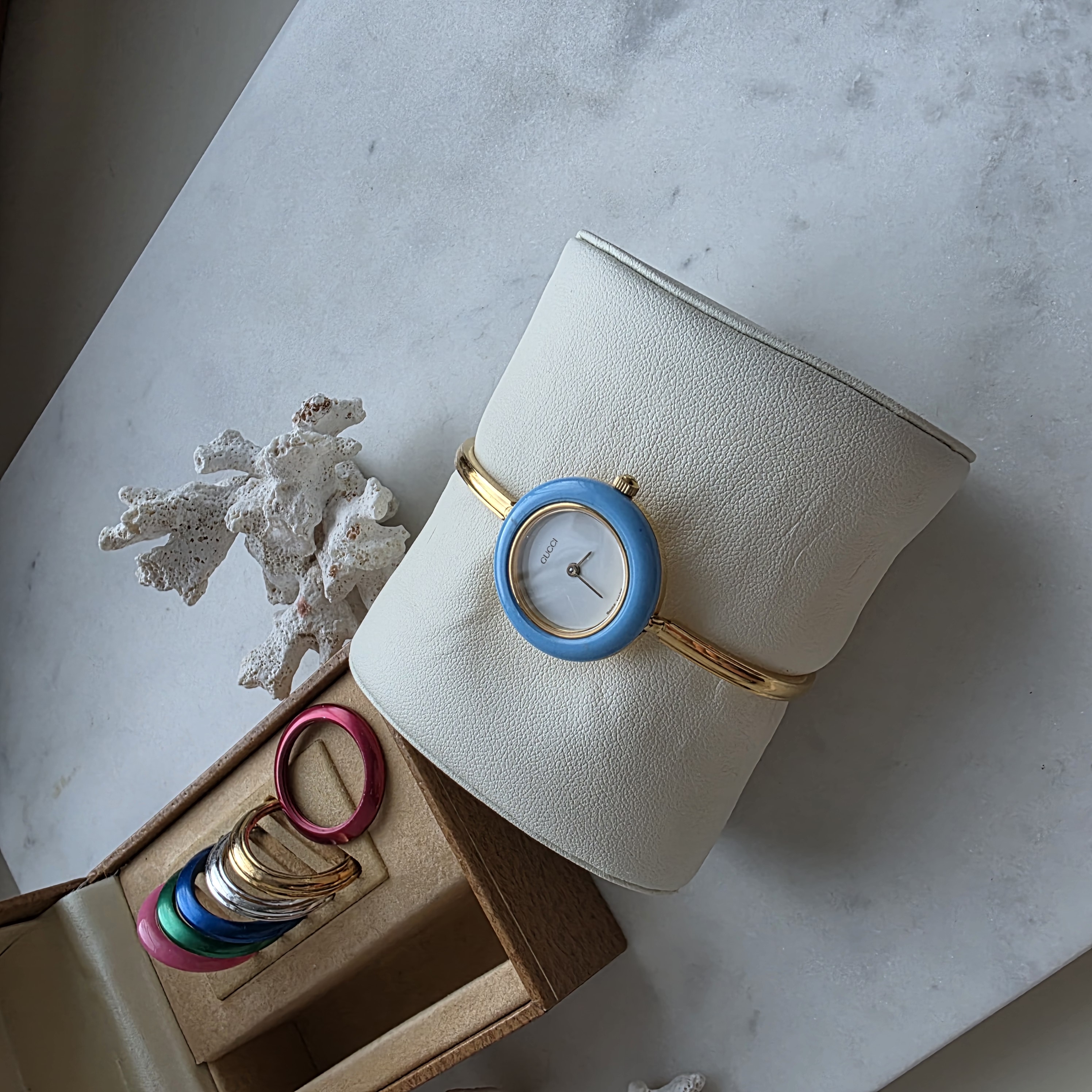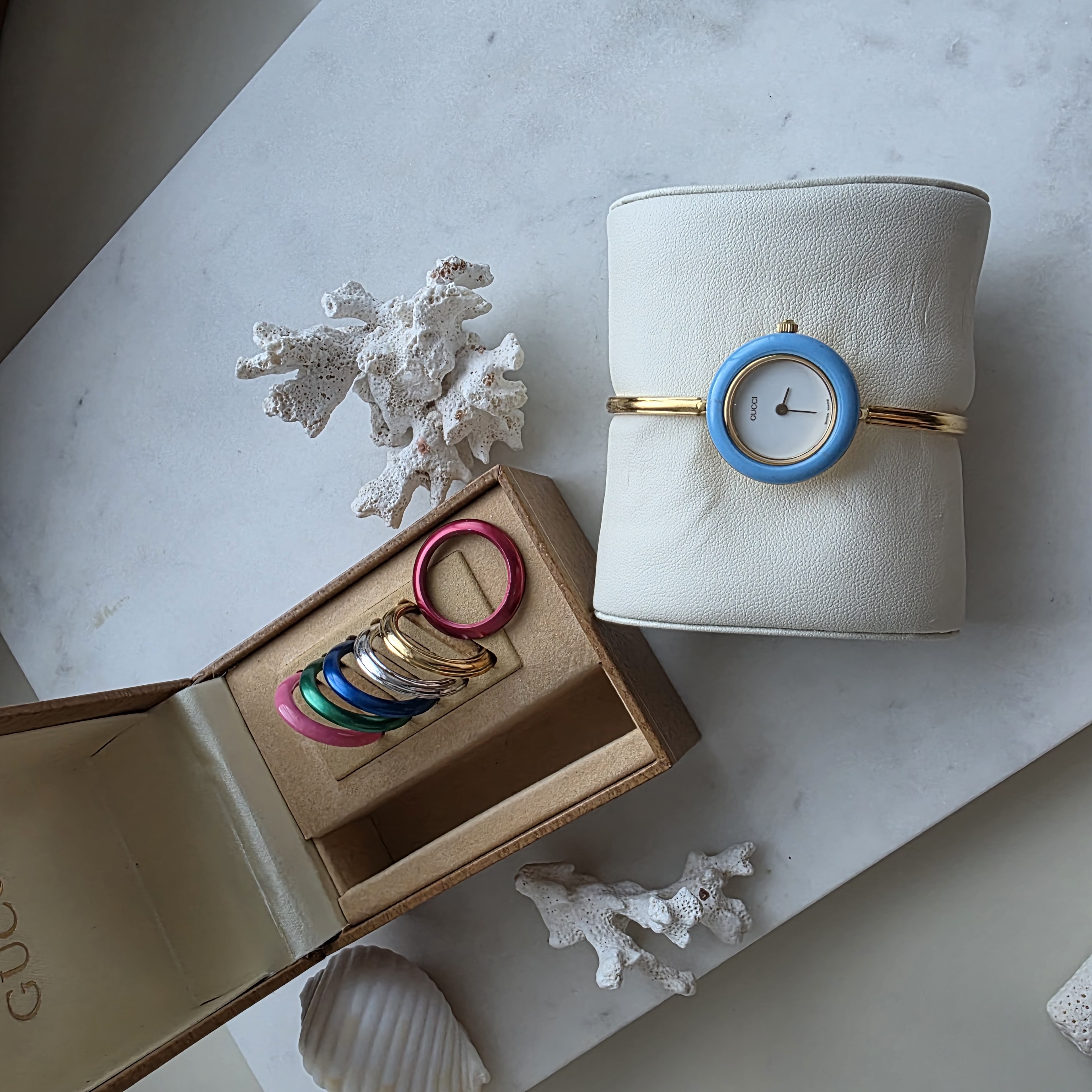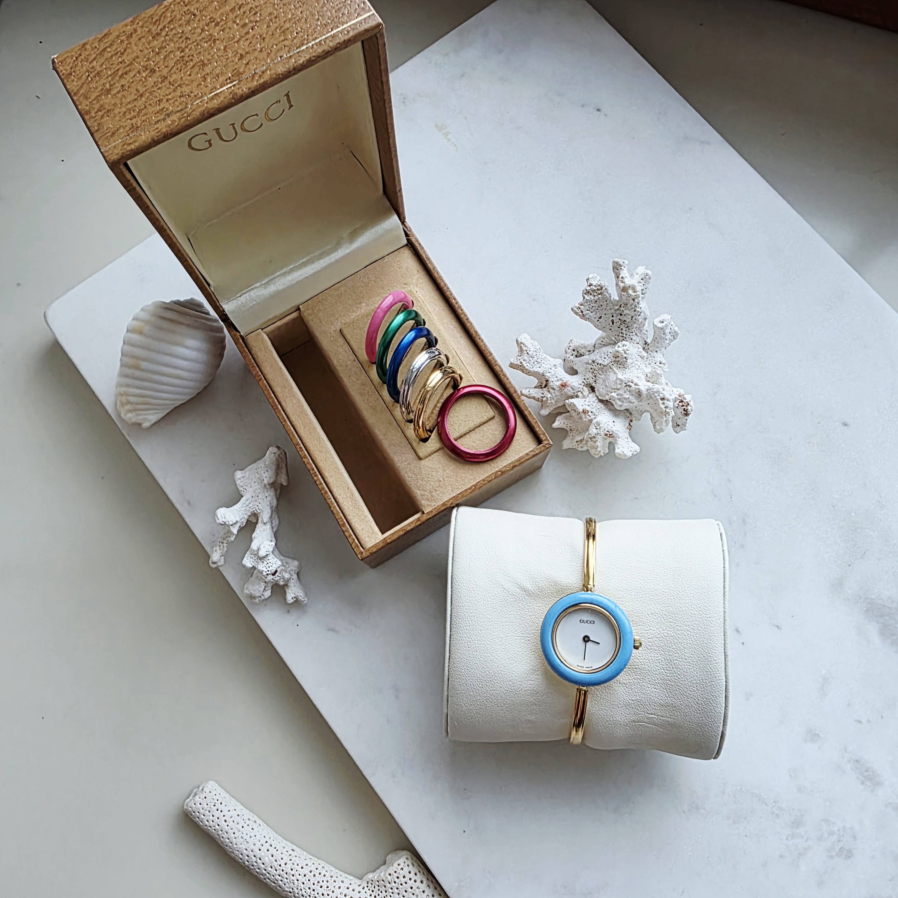 Шикарные часы Gucci в родном футляре с 7 безелями. Часы в прекрасном состоянии, безели без трещин, ремешок в идеальном состоянии.