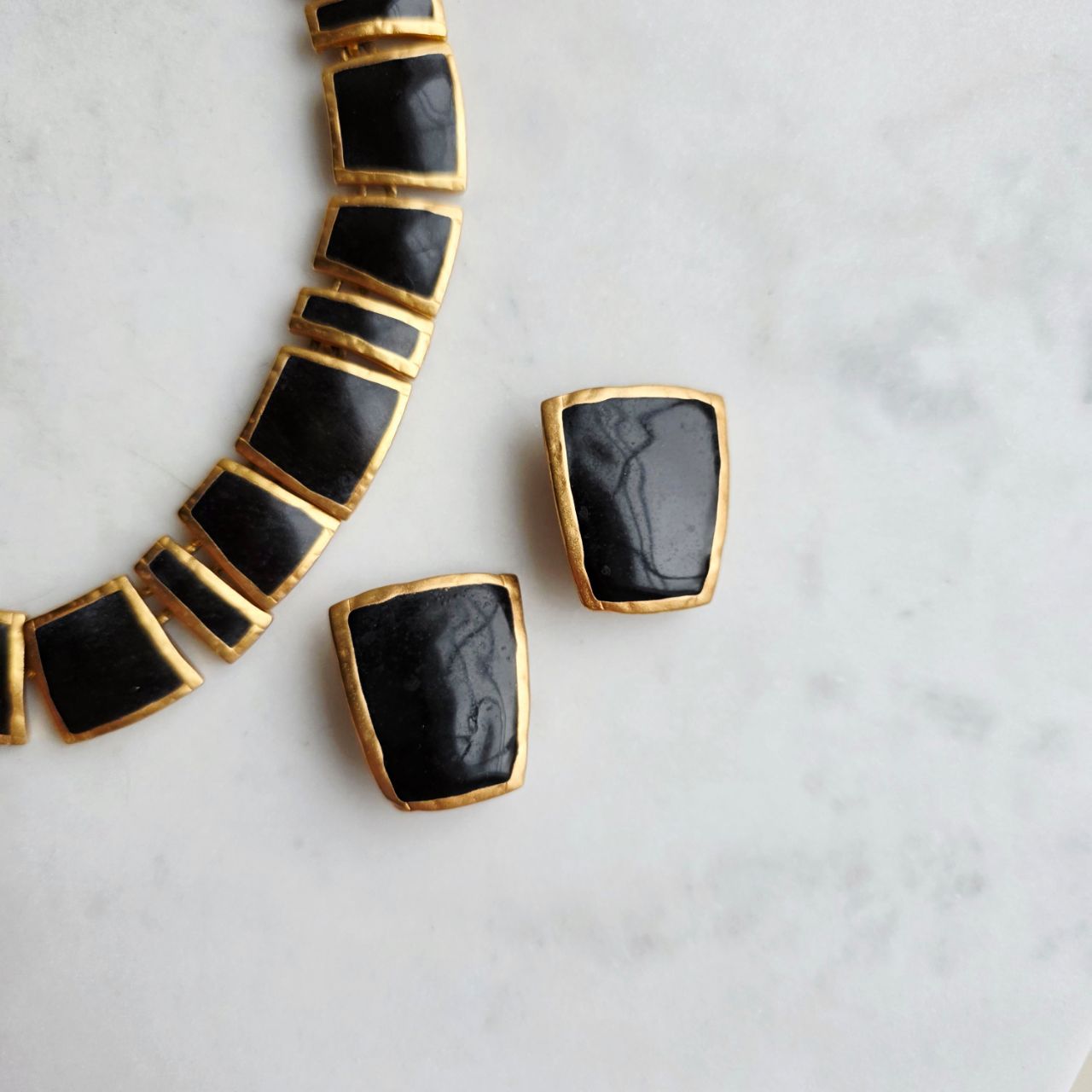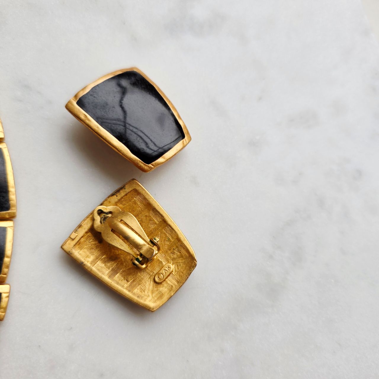 Графичные клипсы от дома Anne Klein шикарно смотрятся на ушке. Сочетание цветов идеальное в самом лучшем понимании этого слова: практически всегда мы видим черный и золото, но цвет глубого графитового цвета и матового золота - только здесь. Если это прочитал мужчина, то 100% он ничего не понял :) Когда мы получили колье и клипсы, мы долго хотели оставить их в своей коллекции, они действительно шикарны! Но так как у нас есть точно такая же модель в любимом dark navy, то этот комплект мы решили отдать в продажу. Вот такое честное описание у нас получилось в этот раз!