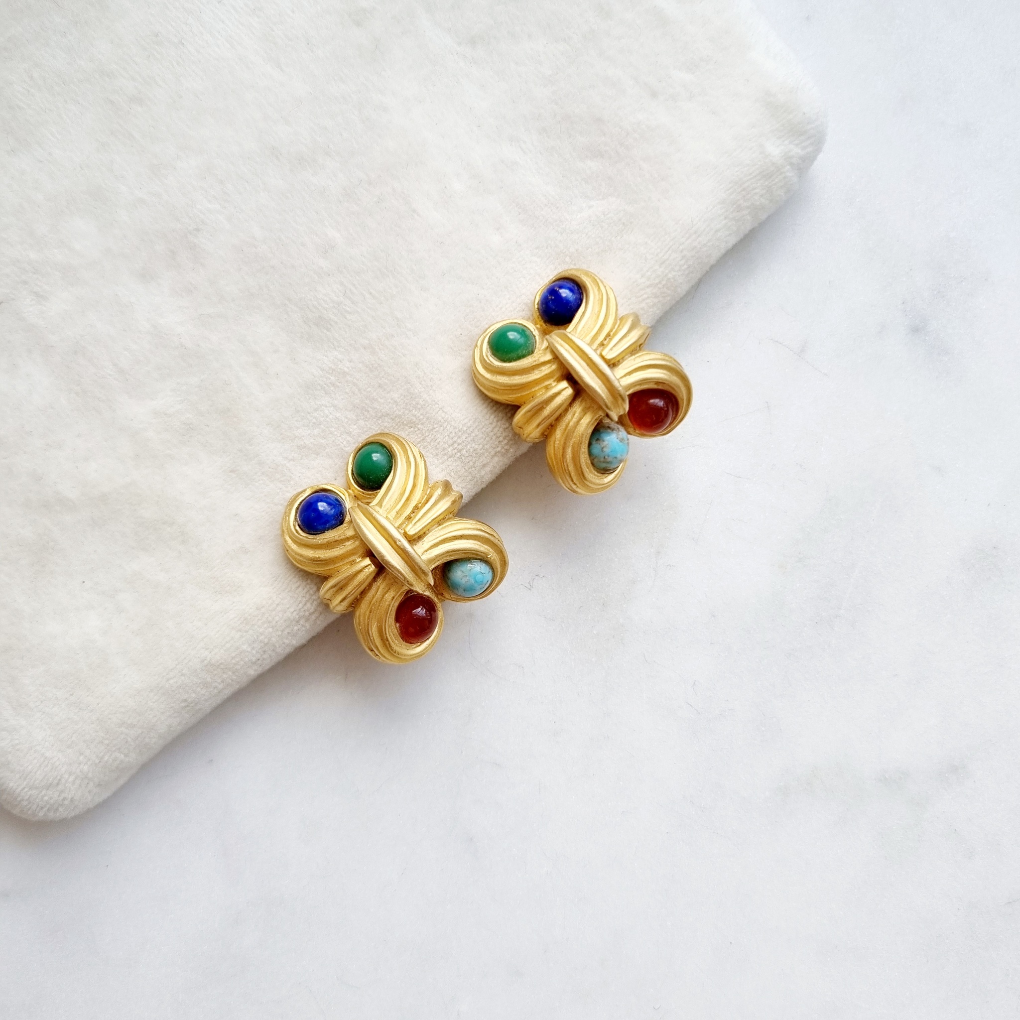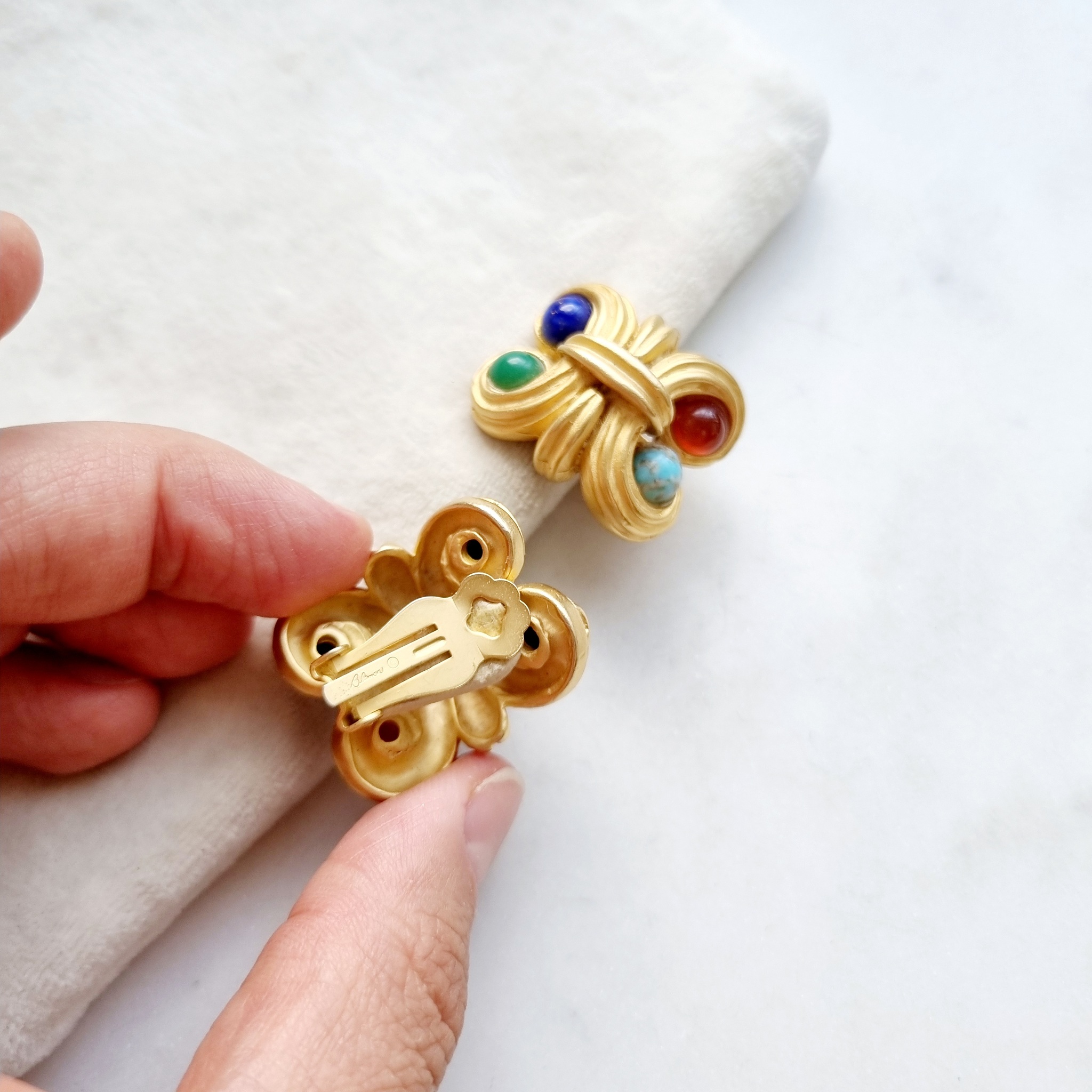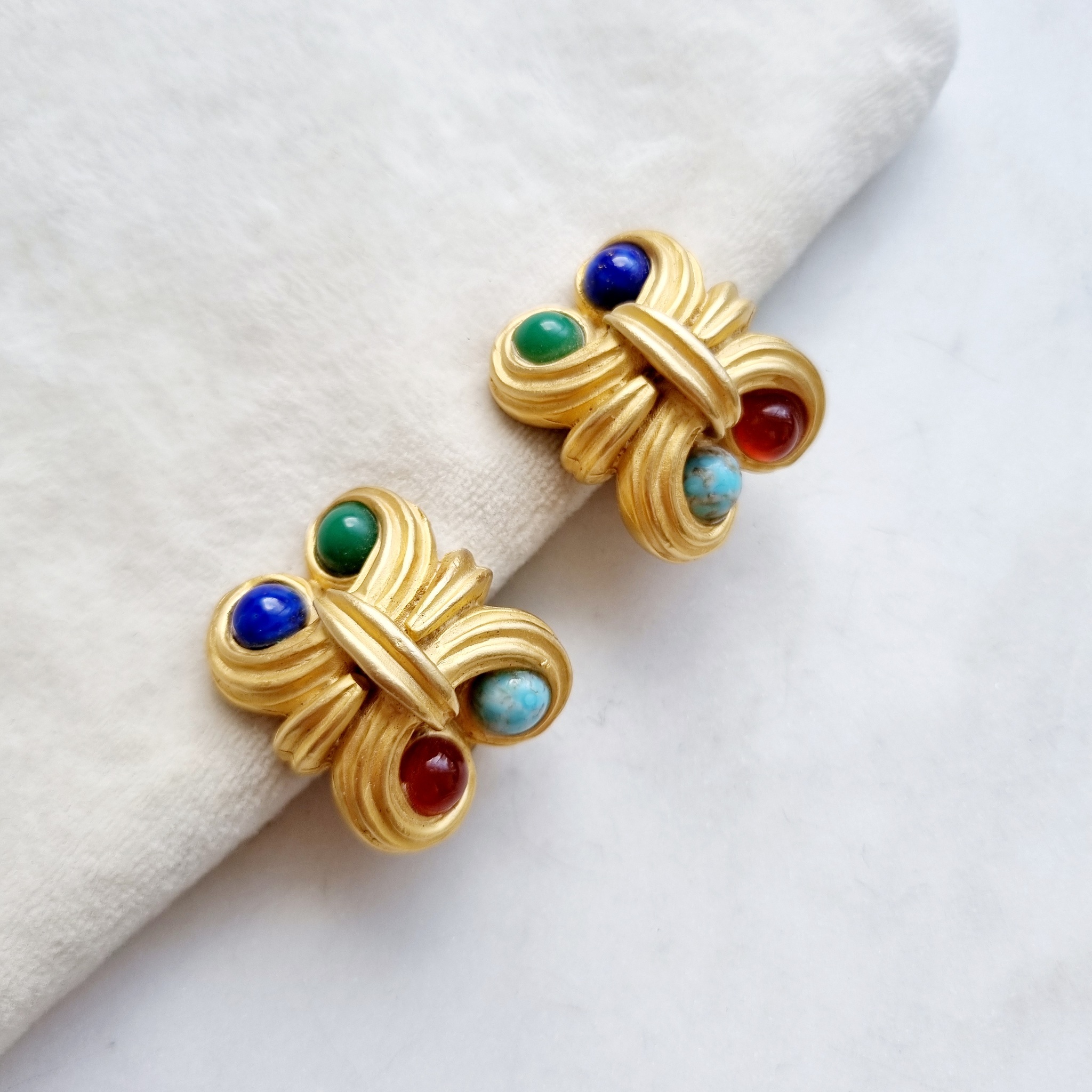 Крупные клипсы в матовом желтом цвете с фантазийным барельефом. Клипсы невероятно красиво смотрятся на ушке. Цветные кабошоны вносят особый характер в образ.