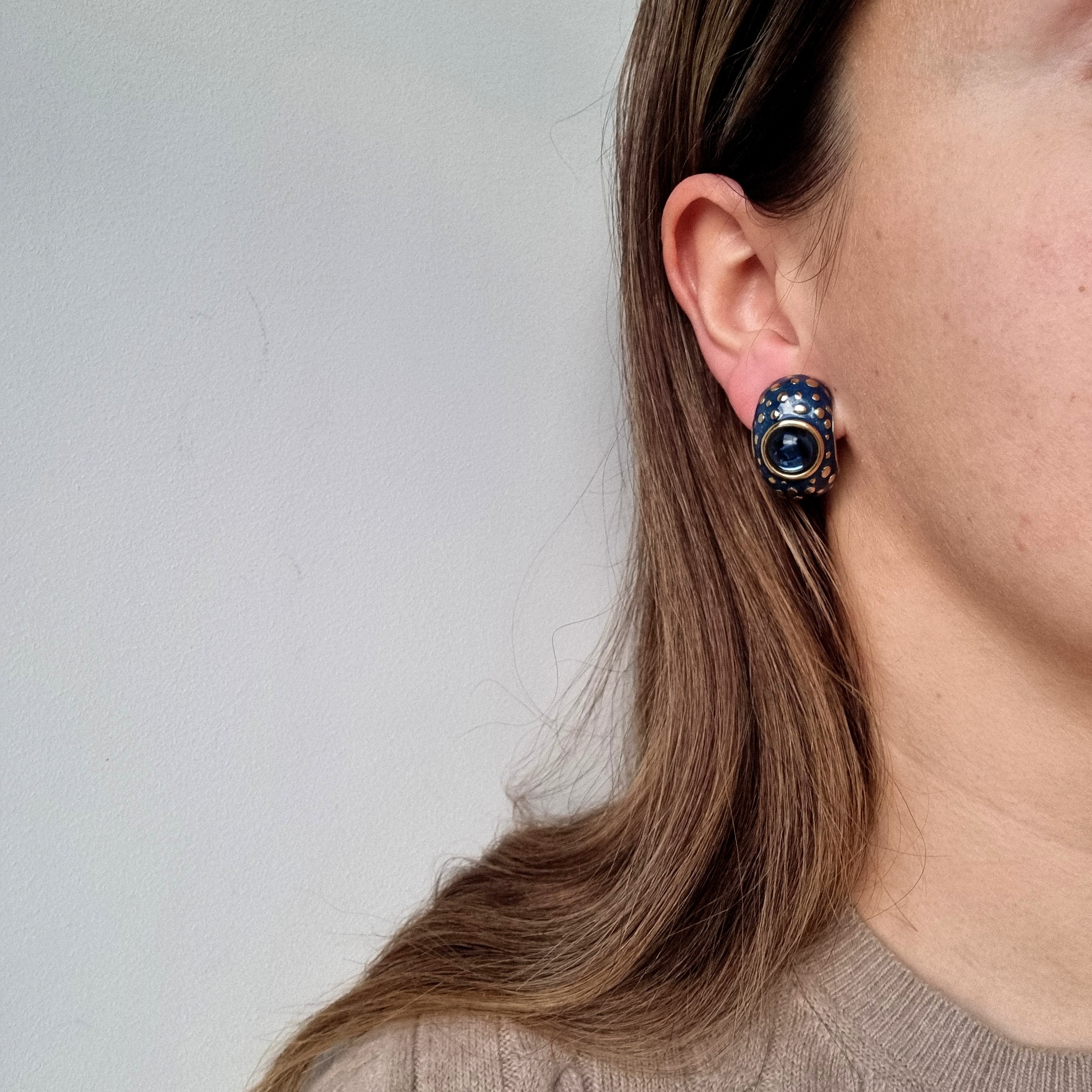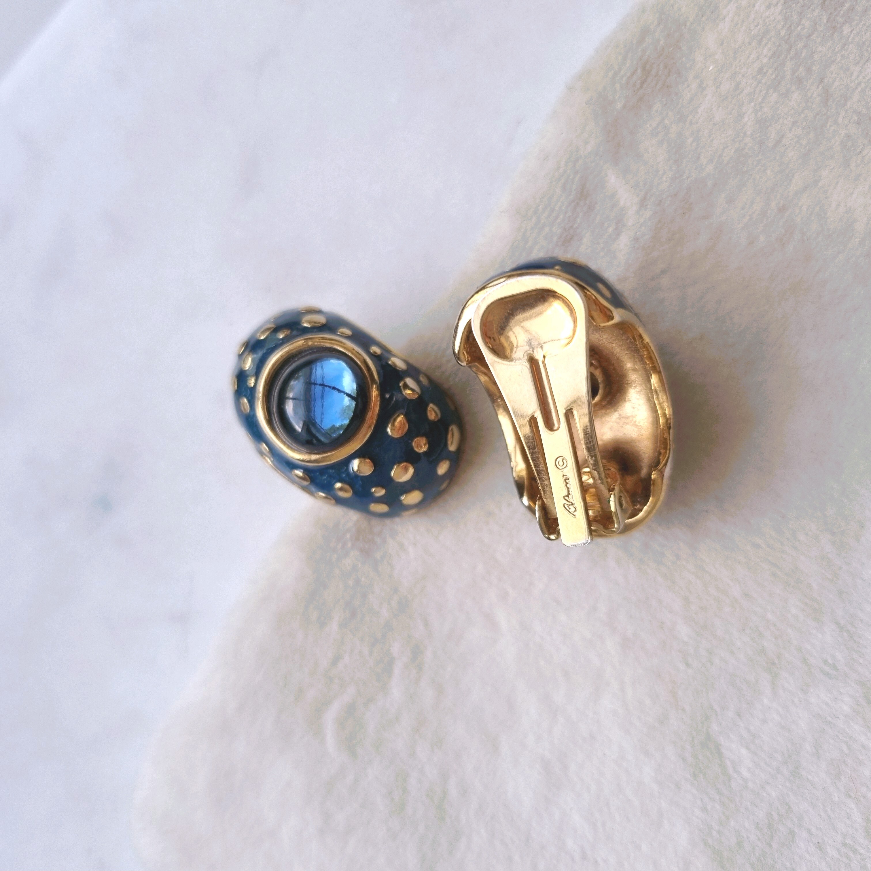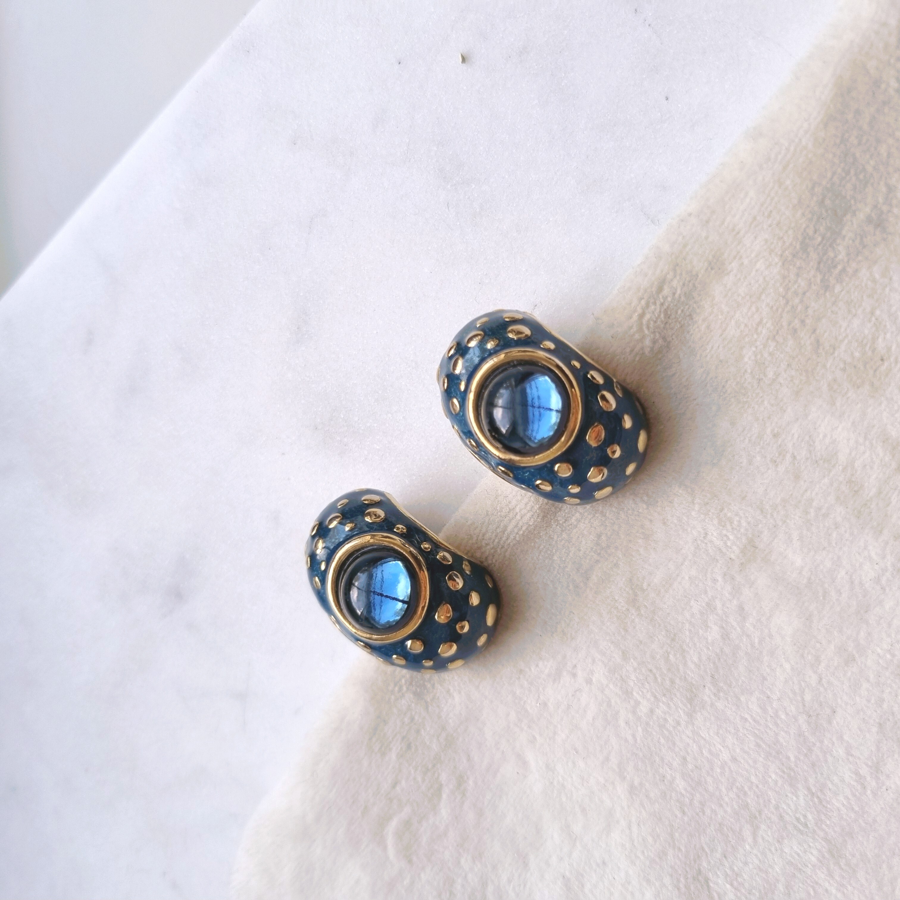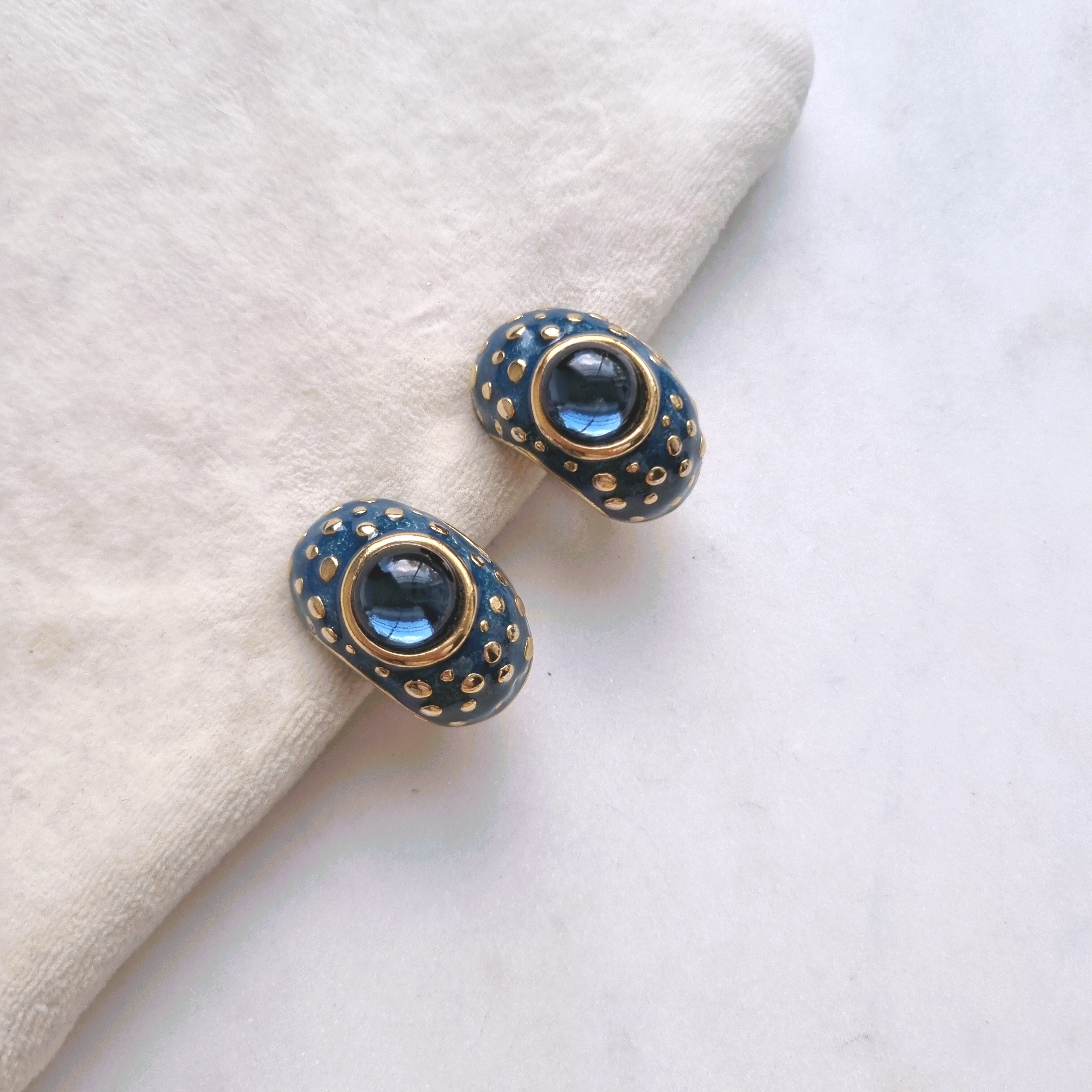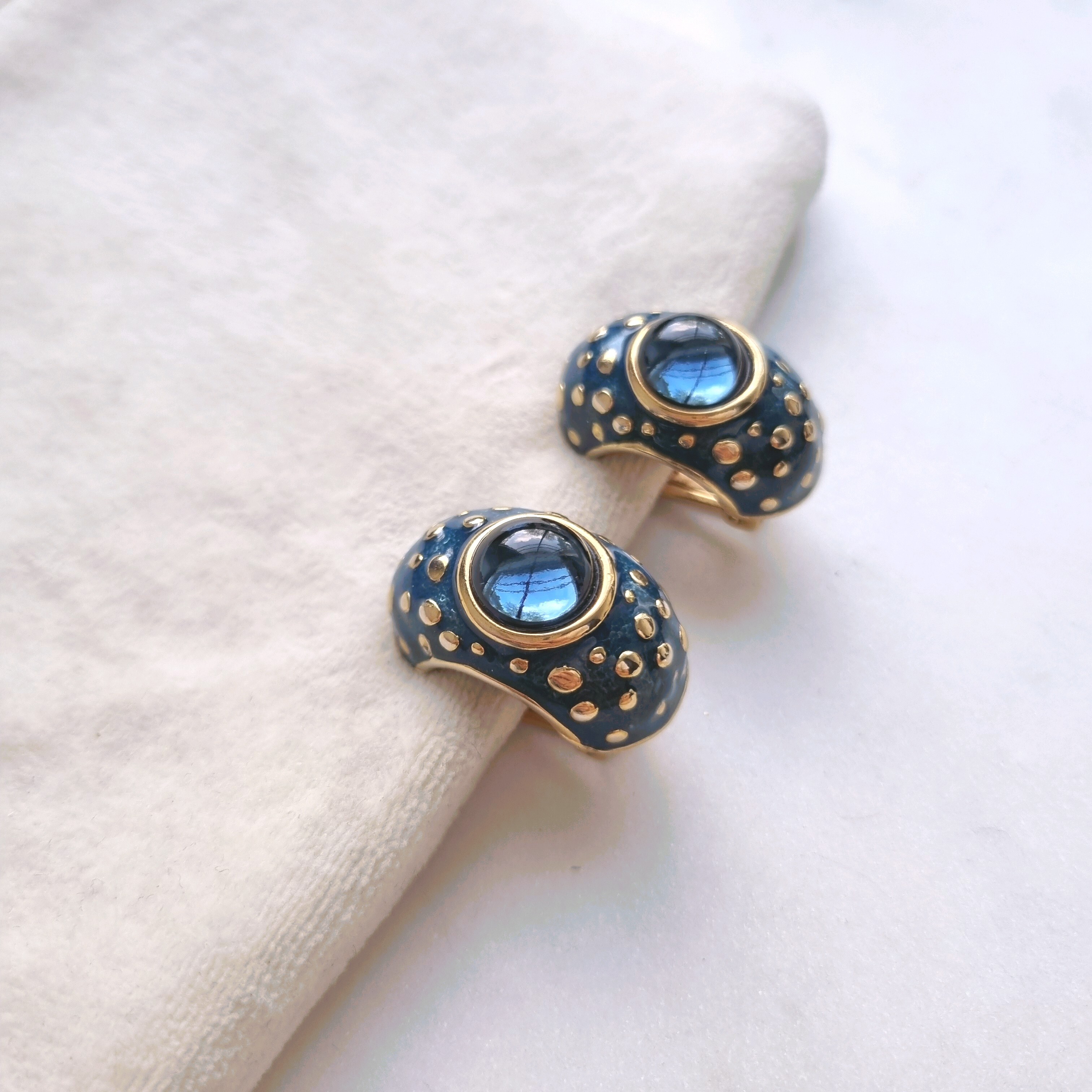 Шикарные клипсы в синей эмали отлично дополнят ваш образ. У клипс удобная застежка. Необычный синий кабошон добавляет мягкое свечение и приковывает к себе внимание.