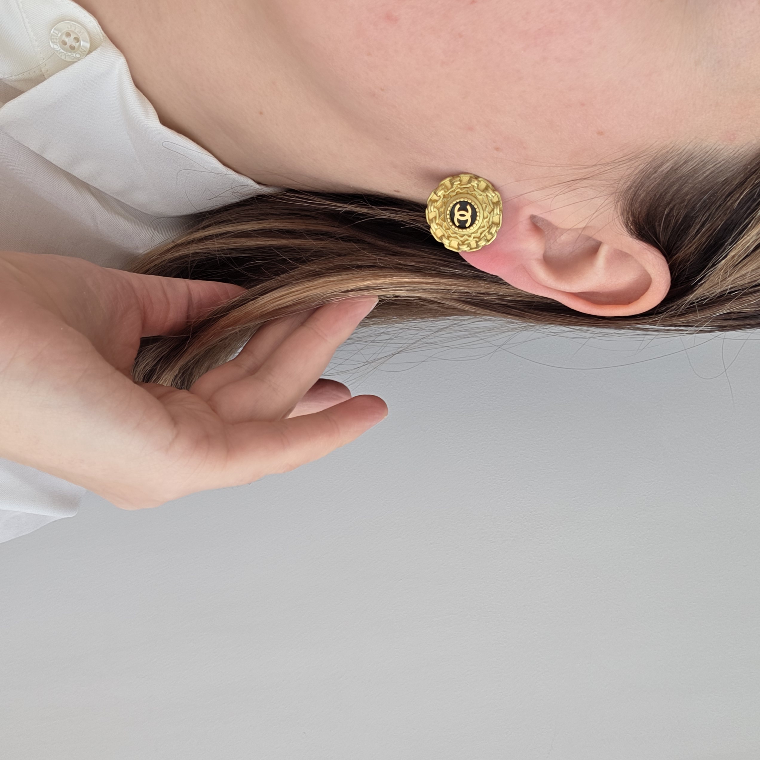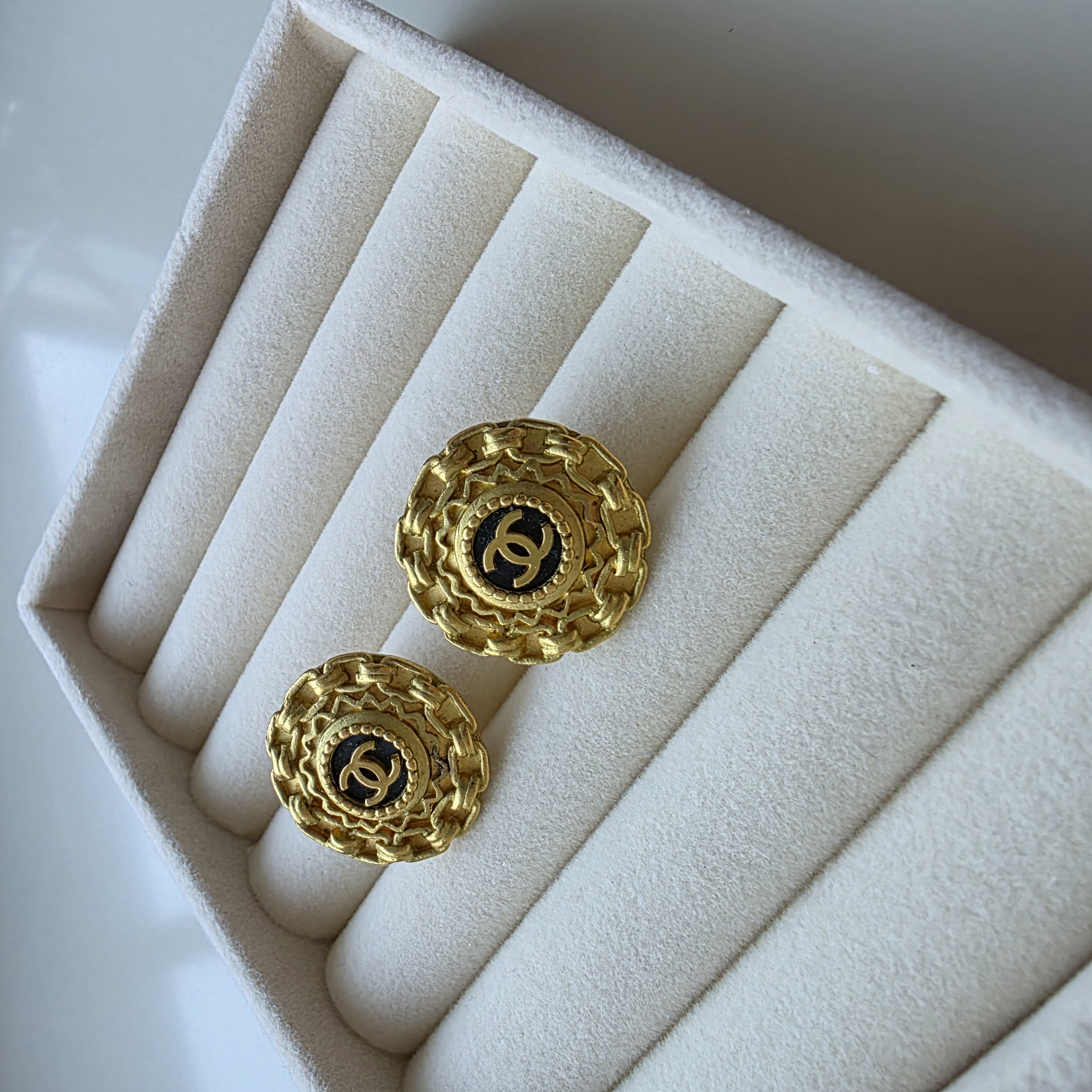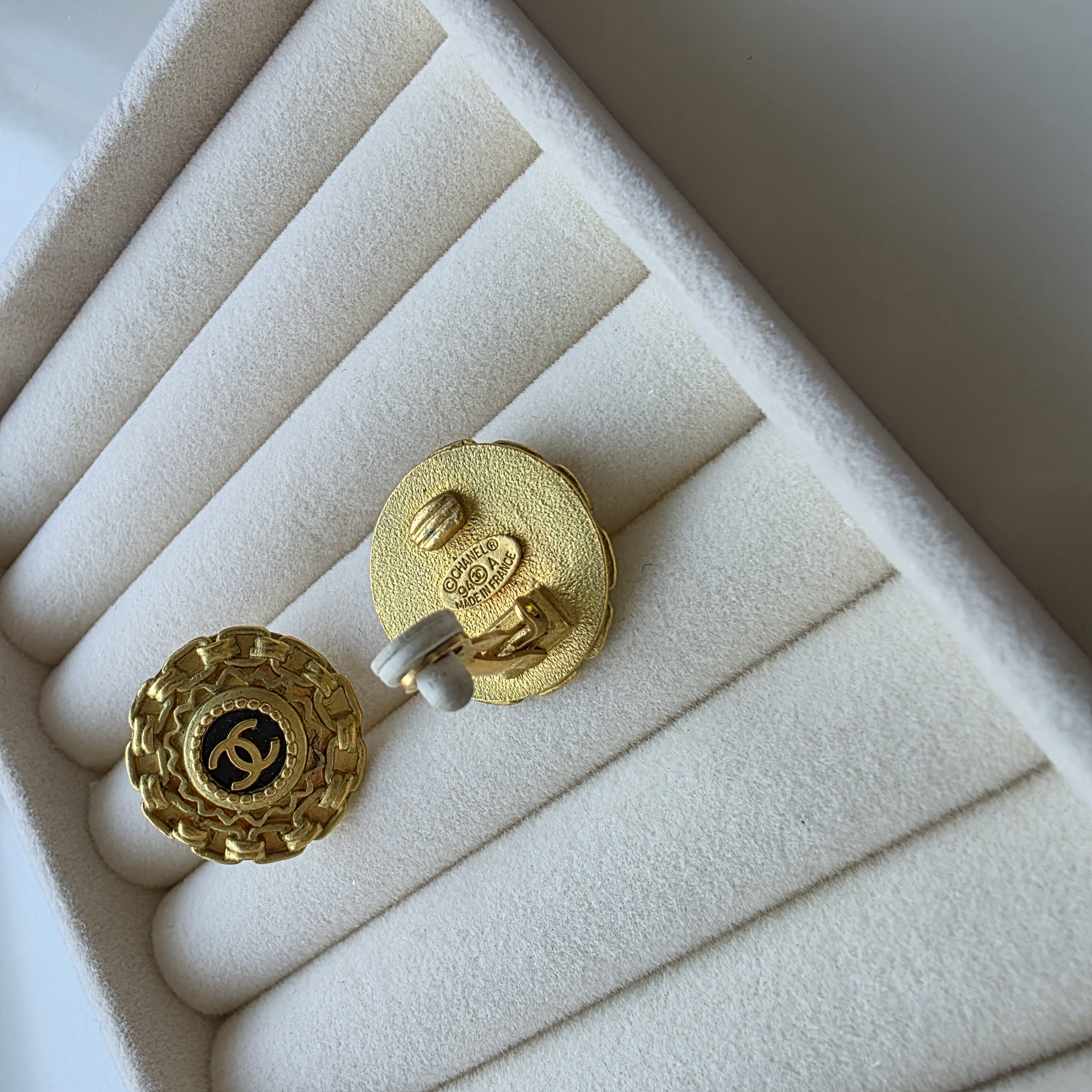 Клипсы от дома Chanel круглой формы. Стильный логотип бренда на черном фоне благородно окружает лента из цепочки. У клипс идеальный размер: они удобны как для дневных образов, а также отлично выпишутся в вечерний.