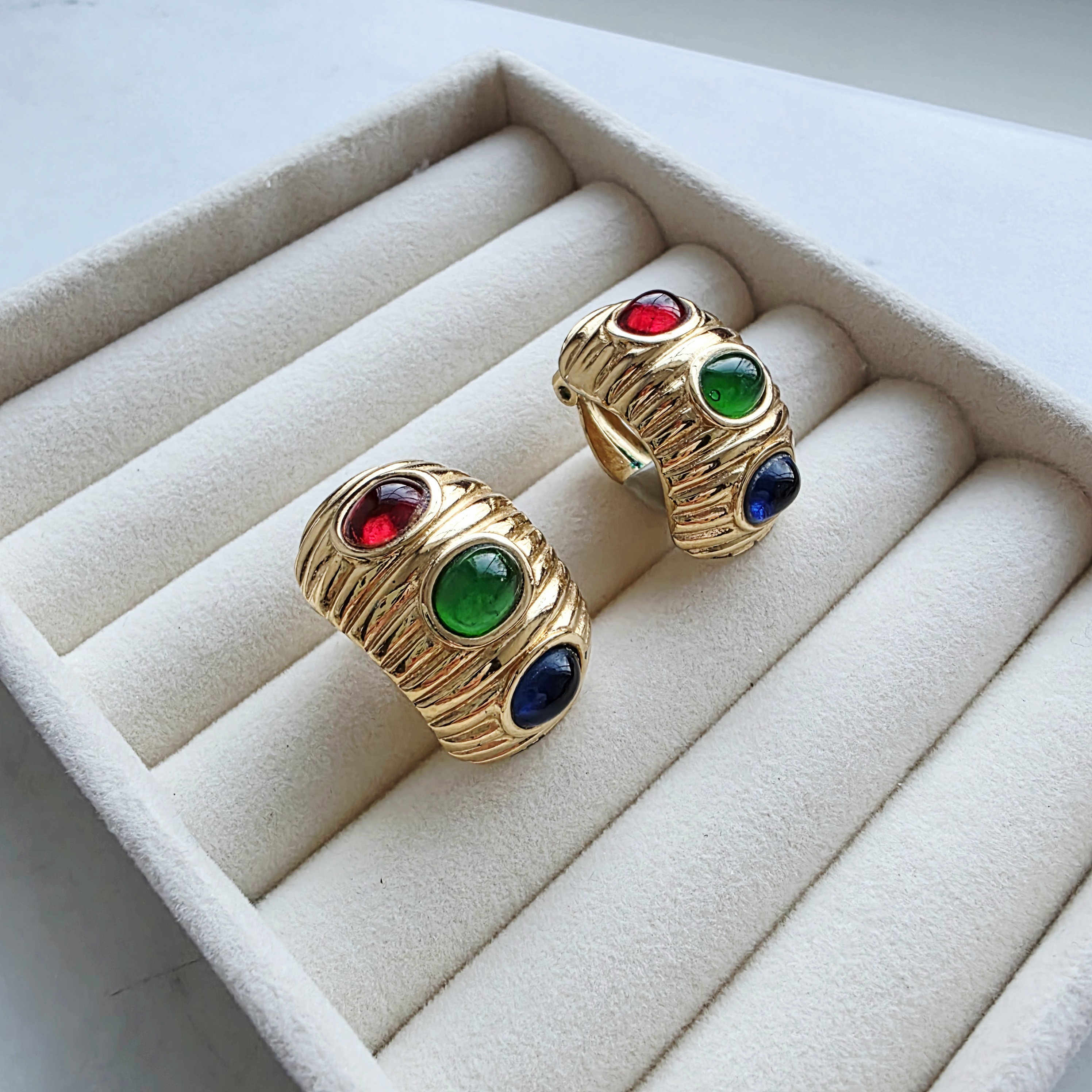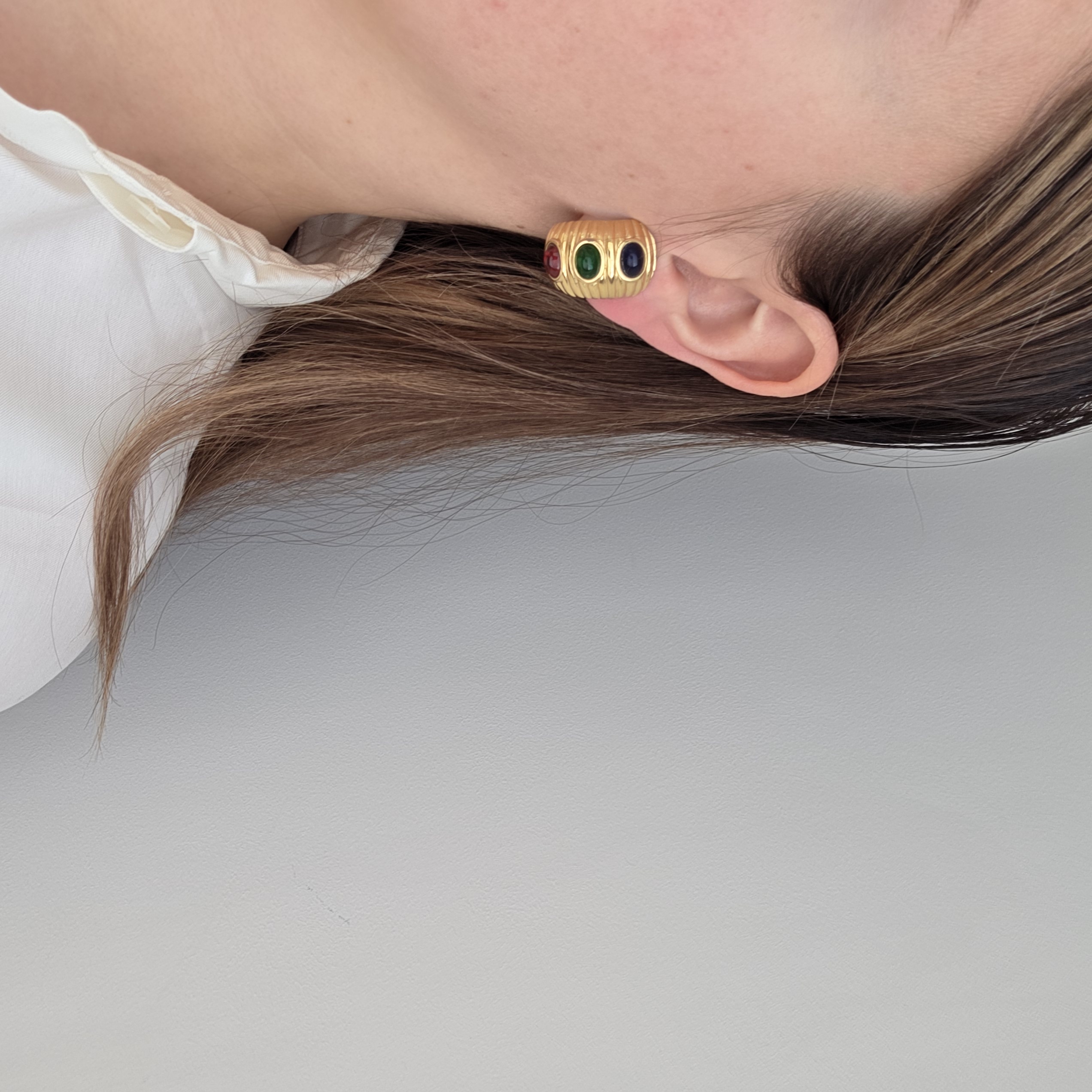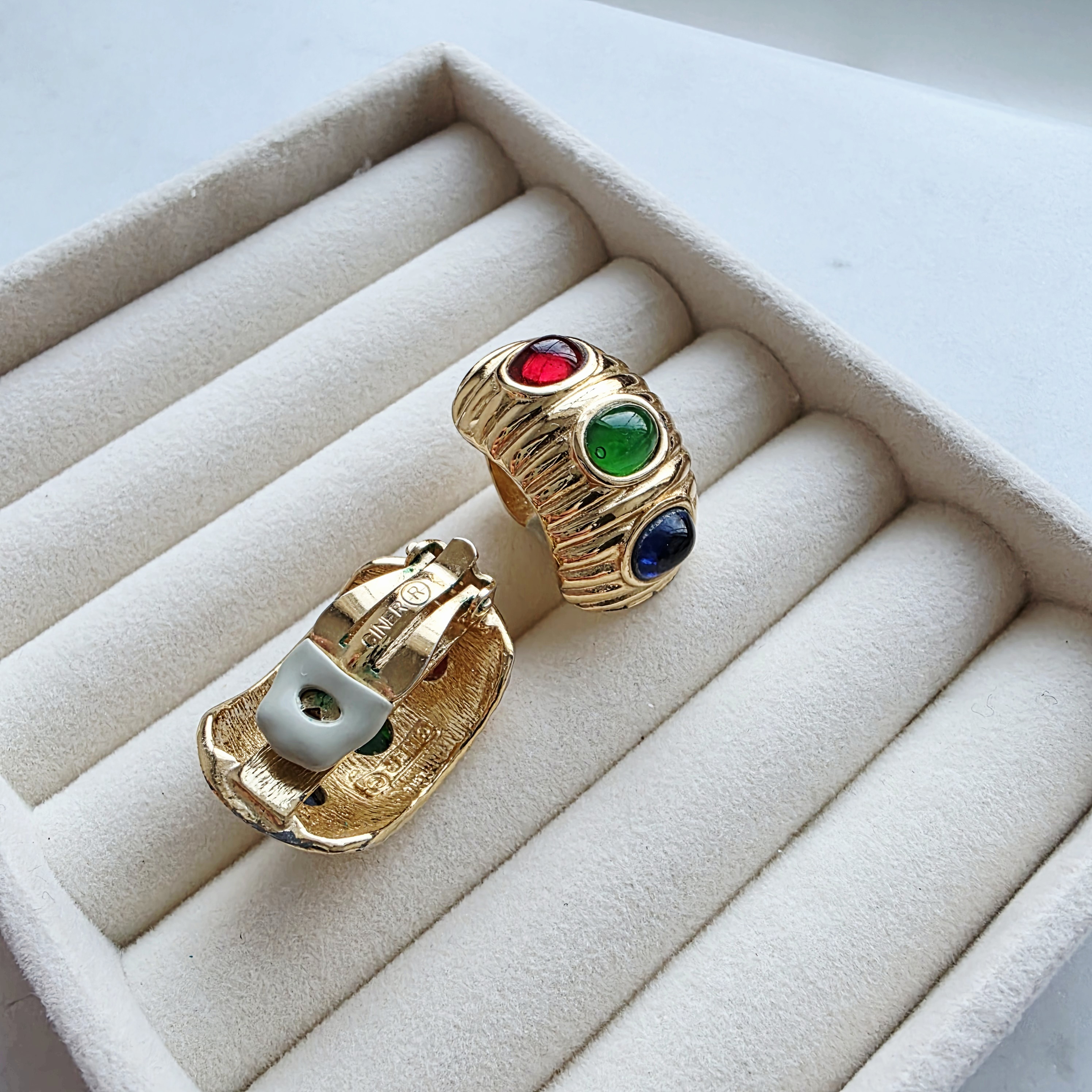 Шикарные клипсы от дома Ciner выполнены в виде ленты золотого цвета, в которую инкрустированы три стеклянных кабошона зеленого, синего и красного цвета. Клипсы смотрятся несомненно очень "породисто" в лучших традициях дома Ciner.  Удобная посадка клипс на мочко позволит забыть, что вы сегодня не в серёжках.