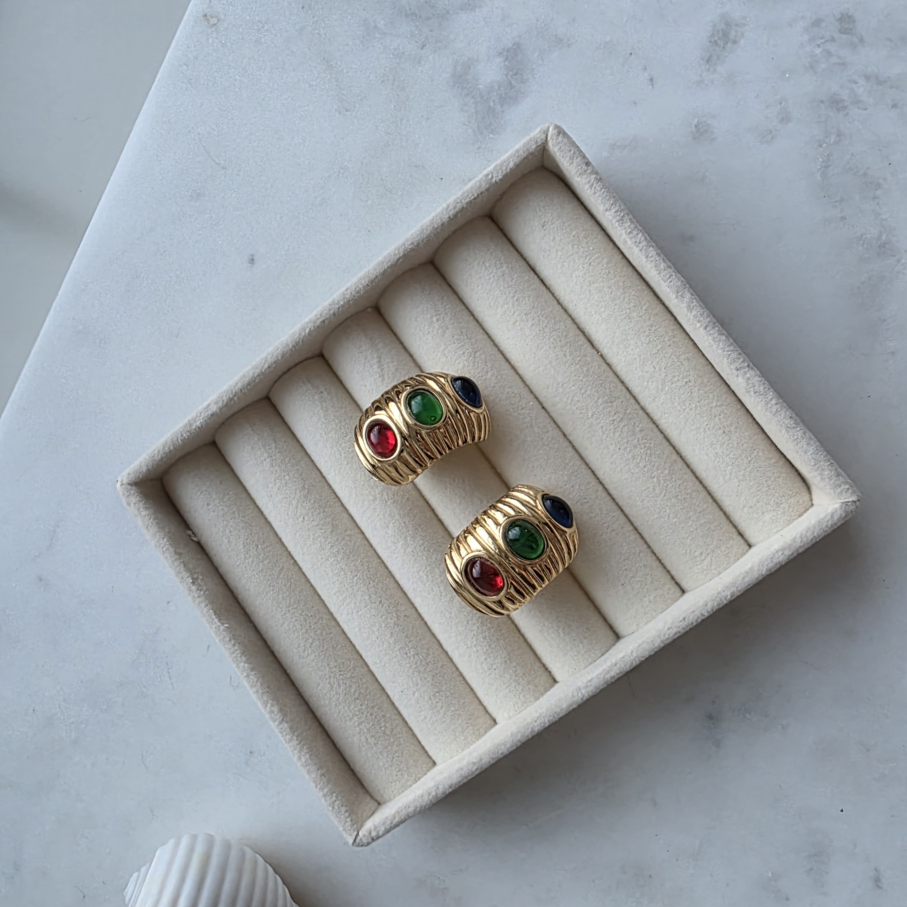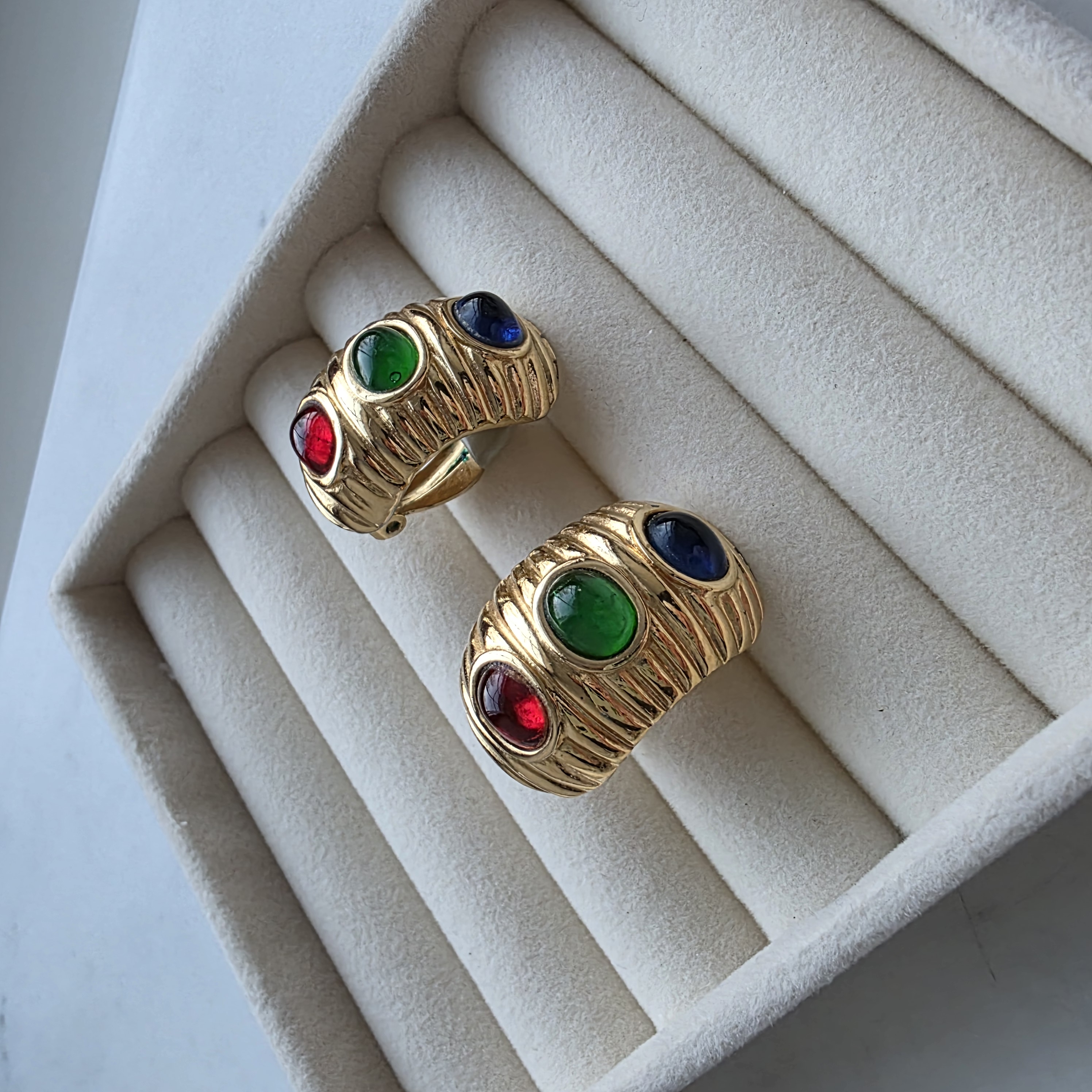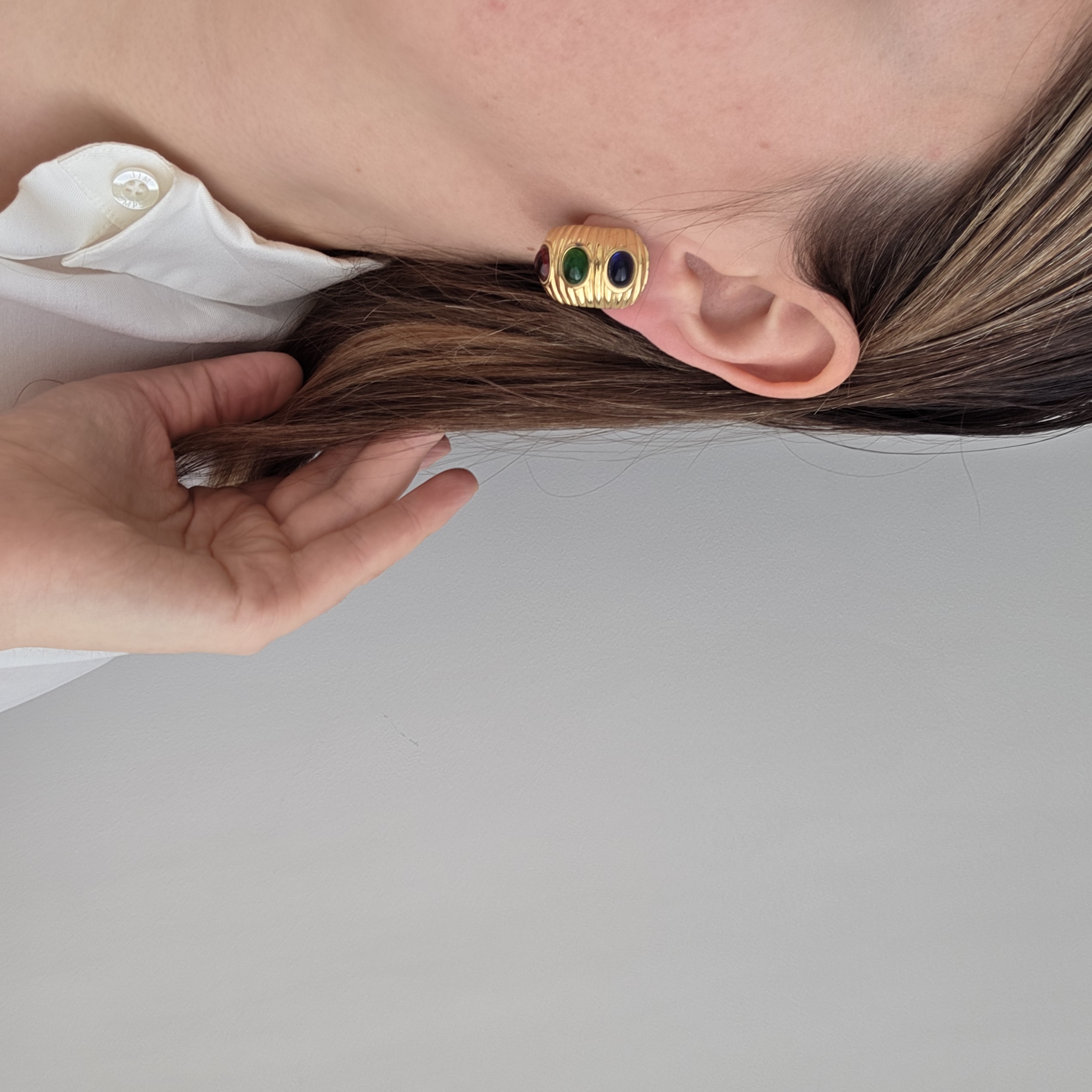 Шикарные клипсы от дома Ciner выполнены в виде ленты золотого цвета, в которую инкрустированы три стеклянных кабошона зеленого, синего и красного цвета. Клипсы смотрятся несомненно очень "породисто" в лучших традициях дома Ciner.  Удобная посадка клипс на мочко позволит забыть, что вы сегодня не в серёжках.