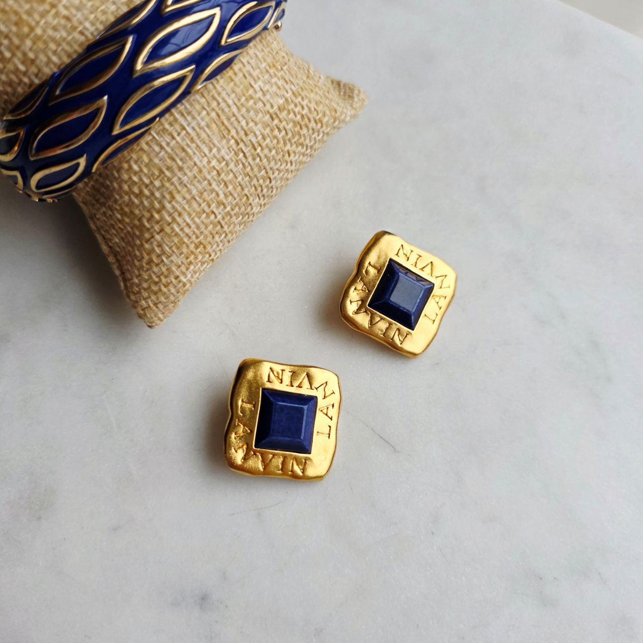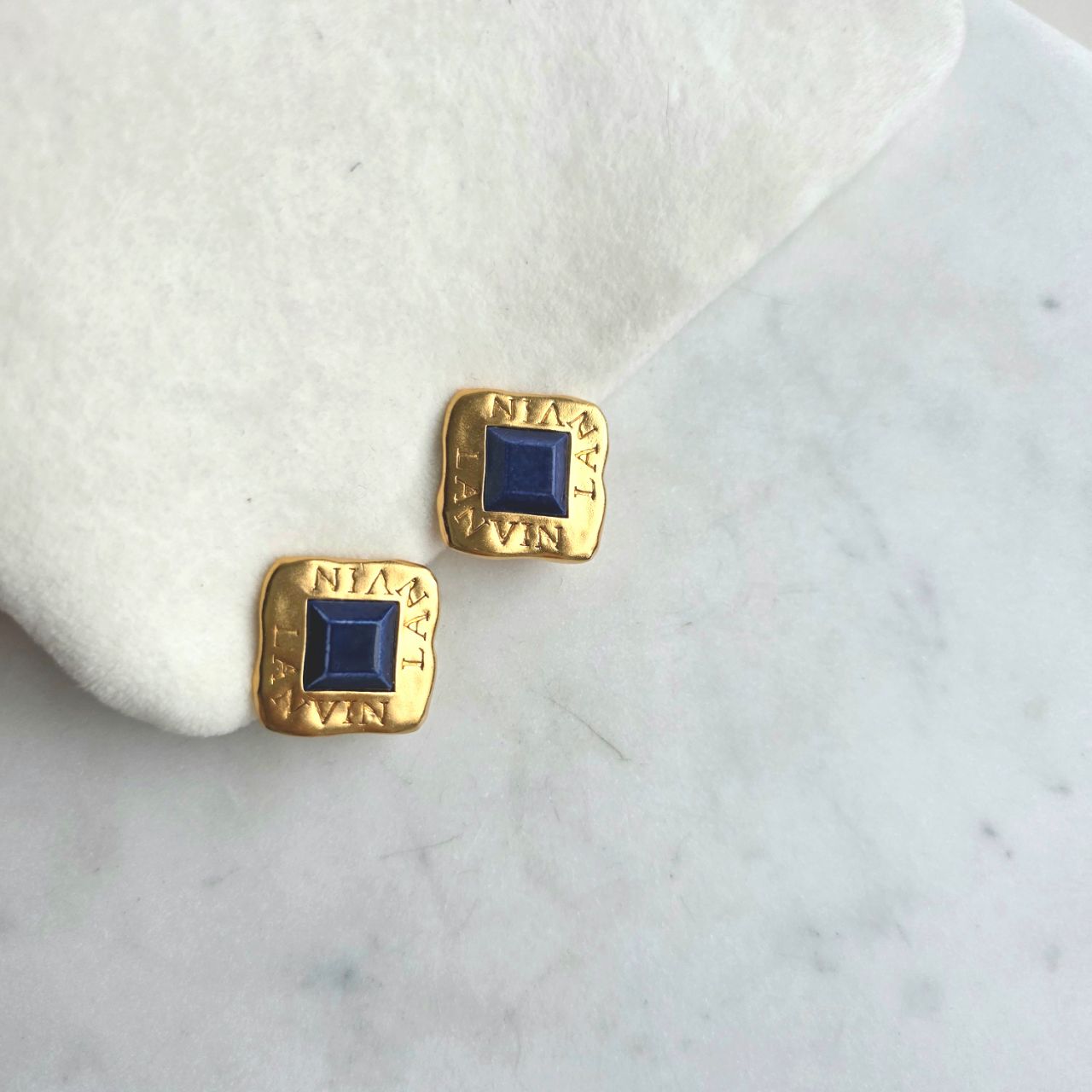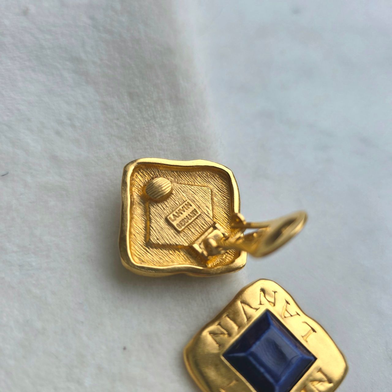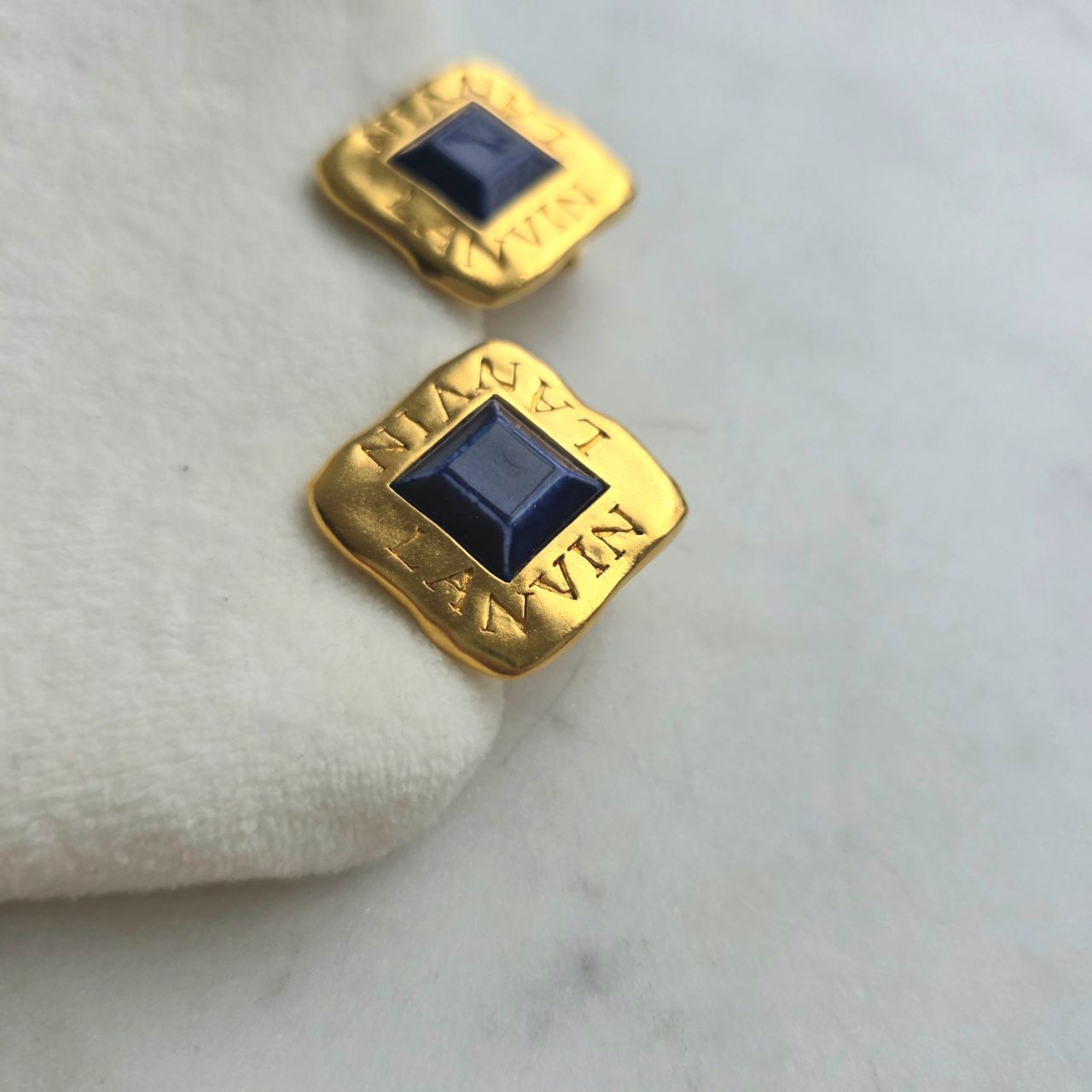 Винтажные клипсы дома Lanvin в форме ромбов выполнены в цвете матовое золото. В середине идет вставка из синего пластика квадратной формы, являющаяся главным акцентом. Сами клипсы увенчаны по краям логотипом бренда. Клипсы удобно садятся на ушко и смотрятся очень эффектно.