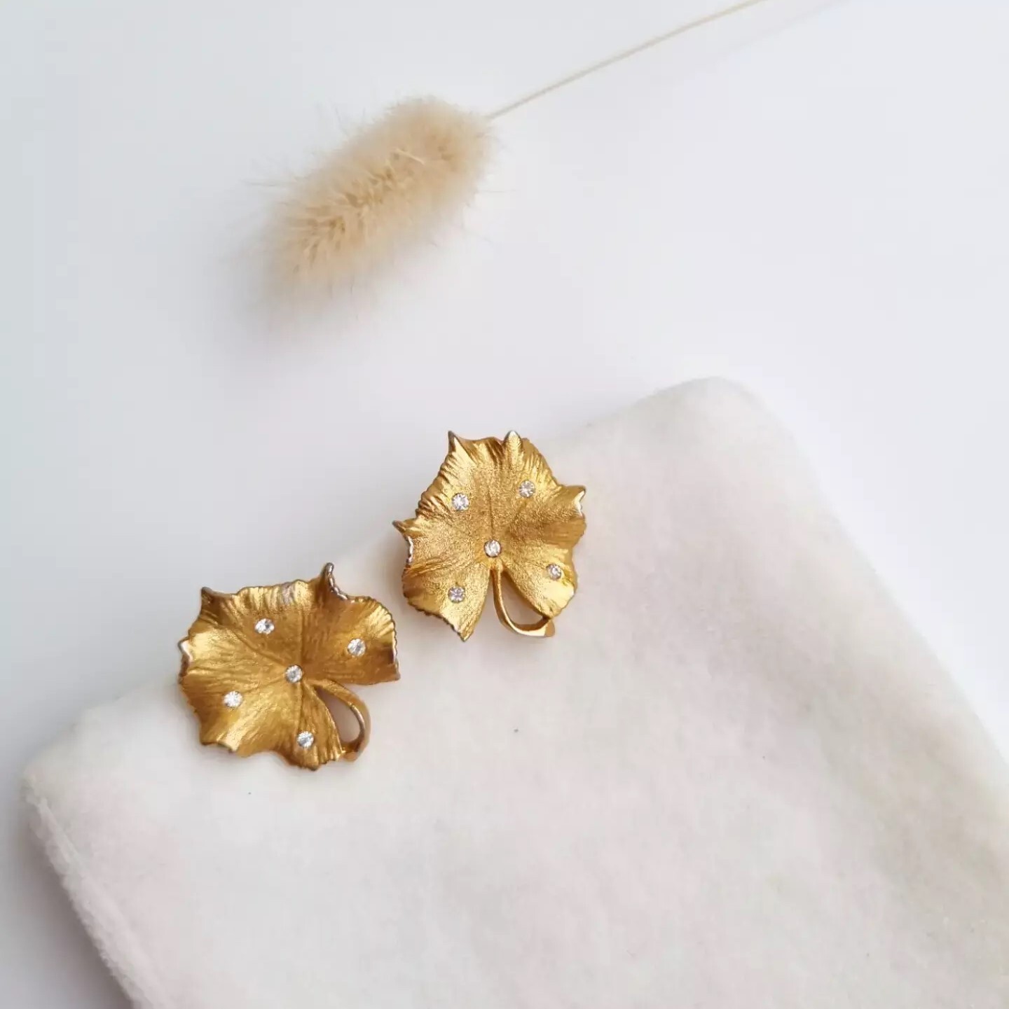 Невероятные по своей работе клипсы Coro создают впечатление живых листьев золотого цвета с капельками дождя. Работа выглядит изумительно, особенно если присмотреться, как выполнены прожилки листьев. Удобная винтовая застёжка: вы всегда можете под себя настроить давление замка на ушко.