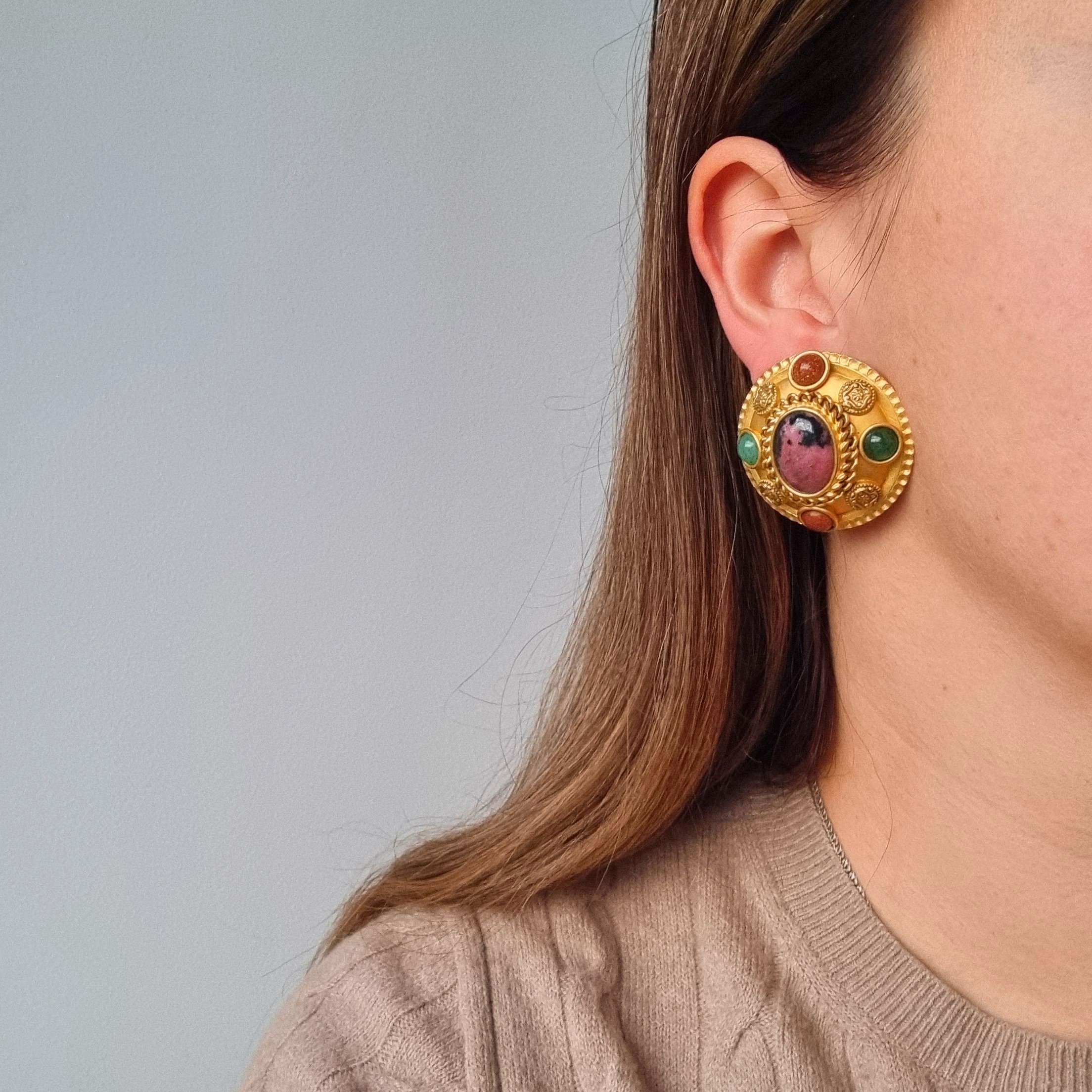 Крупные клипсы круглой формы от известного бренда 80х Natasha Stambouli. Клипсы выполнены в этрусском стиле, который является визитной карточкой бренда. Украшения декорированы полудрагоценными камнями, а покрытие выполнено из 18к золота.