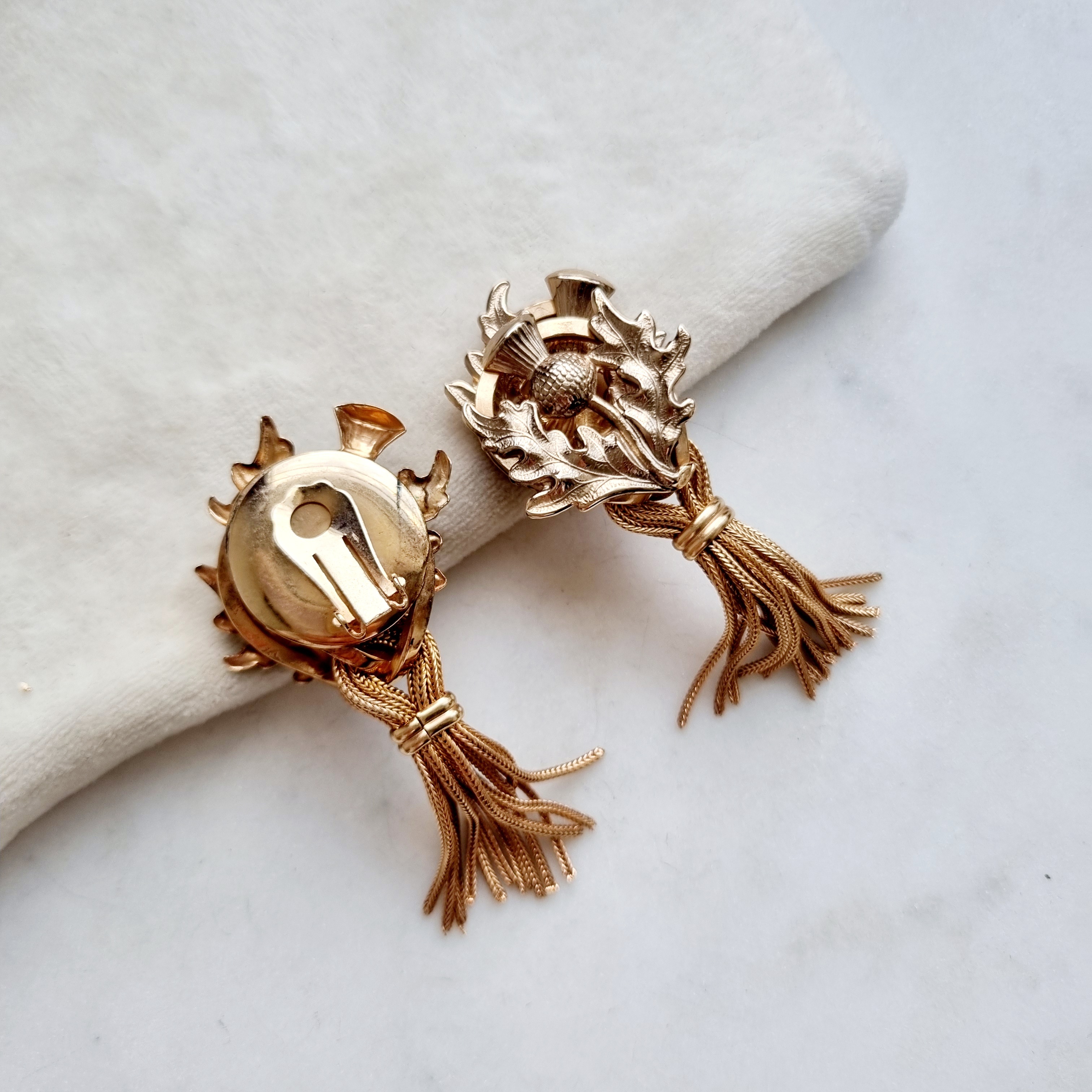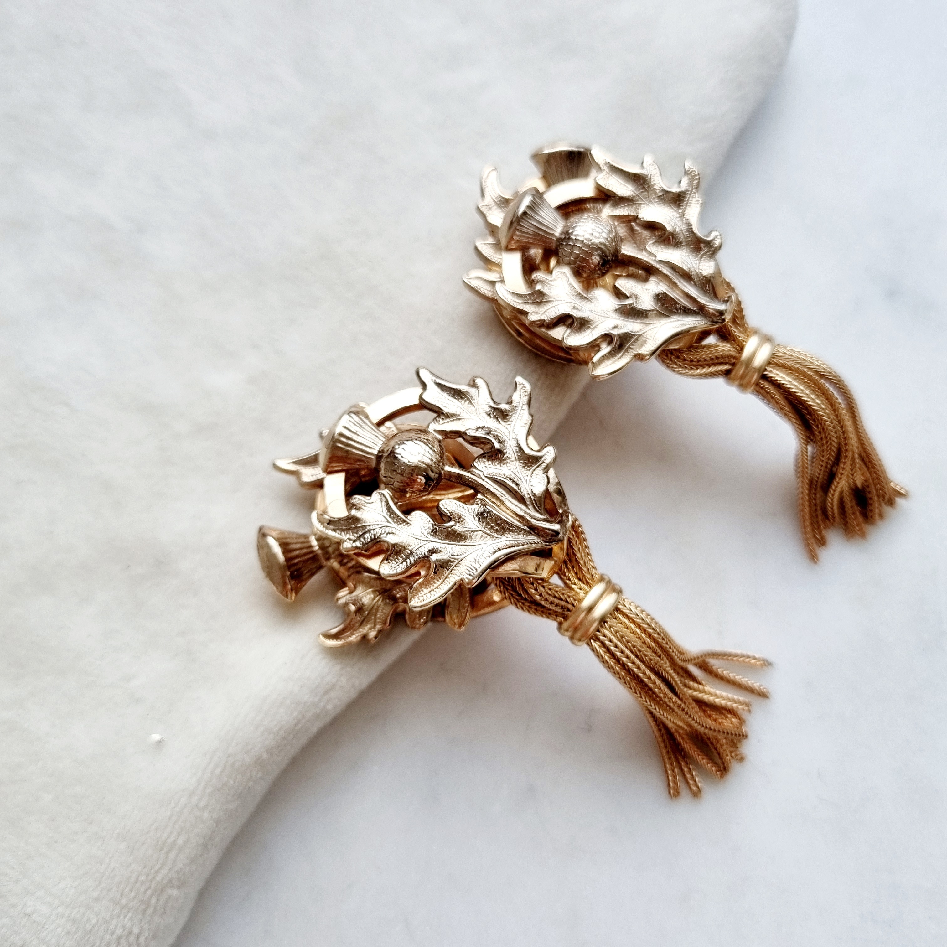 Крупные эффектные клипсы с чертополохом в цвете розовое золото. Клипсы очень интересно исполнены: два симметричных медальона перевязаны лентой, распадающейся на маленькие кисточки. Несмотря на свой крупный размер, клипсы легкие и удобны в ежедневной носке.