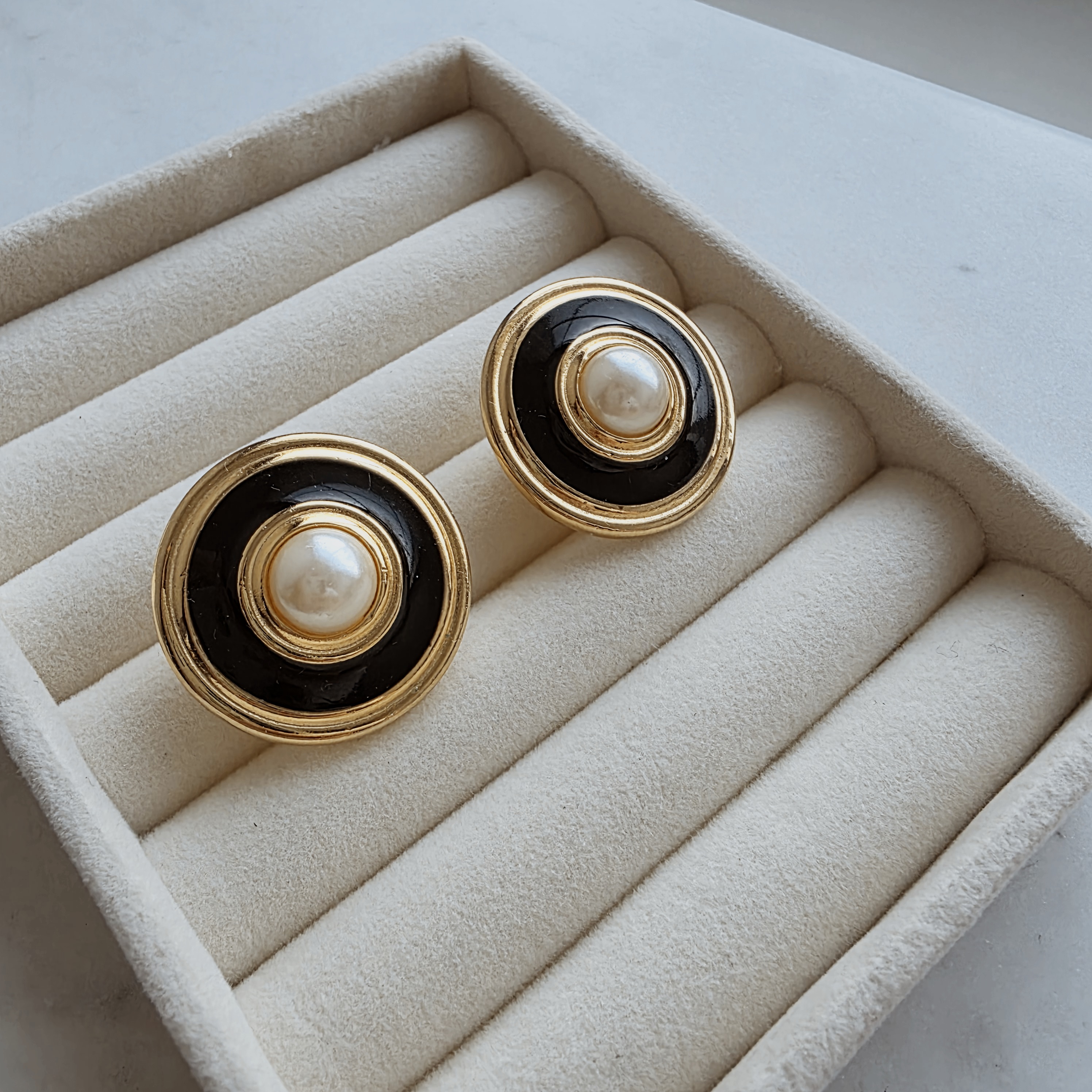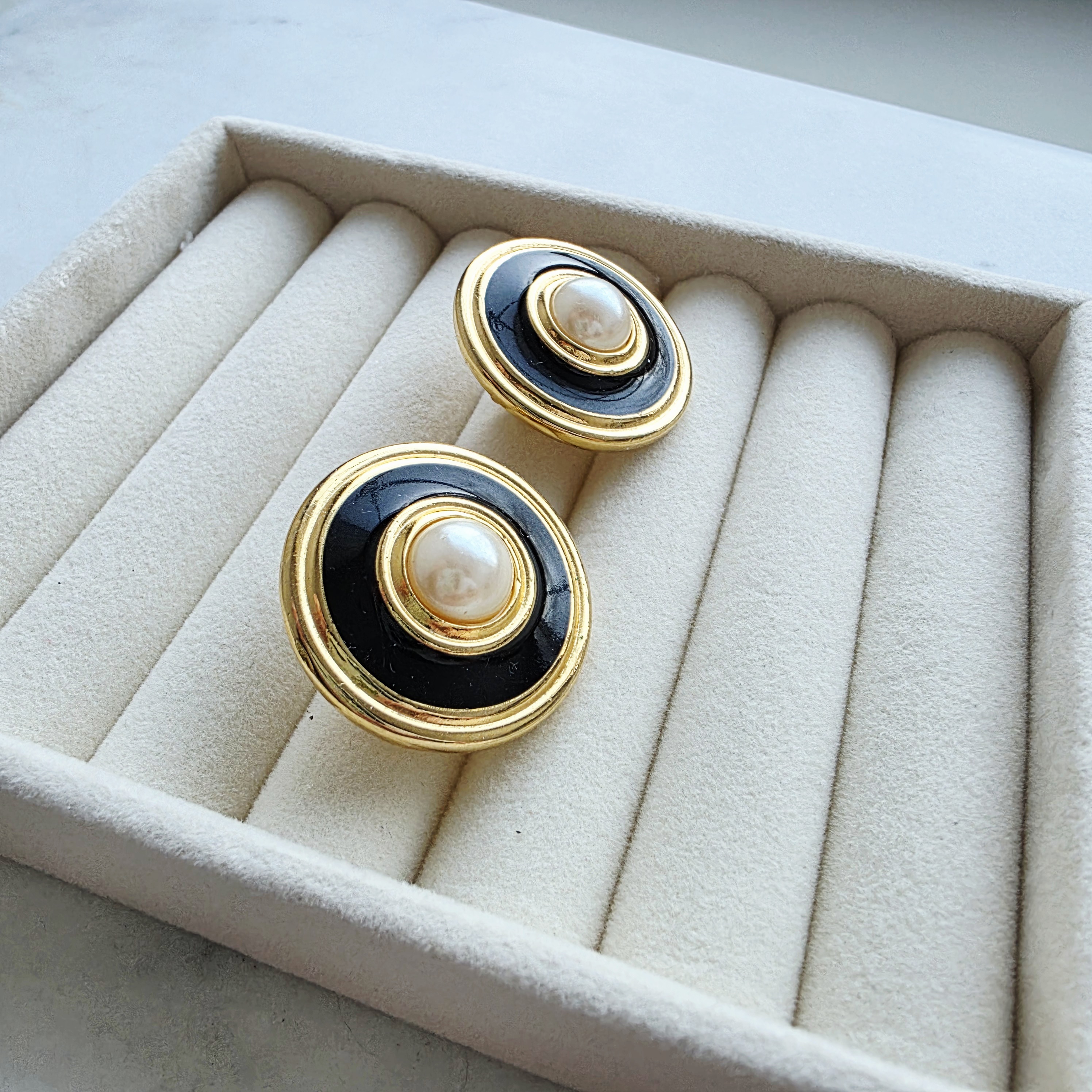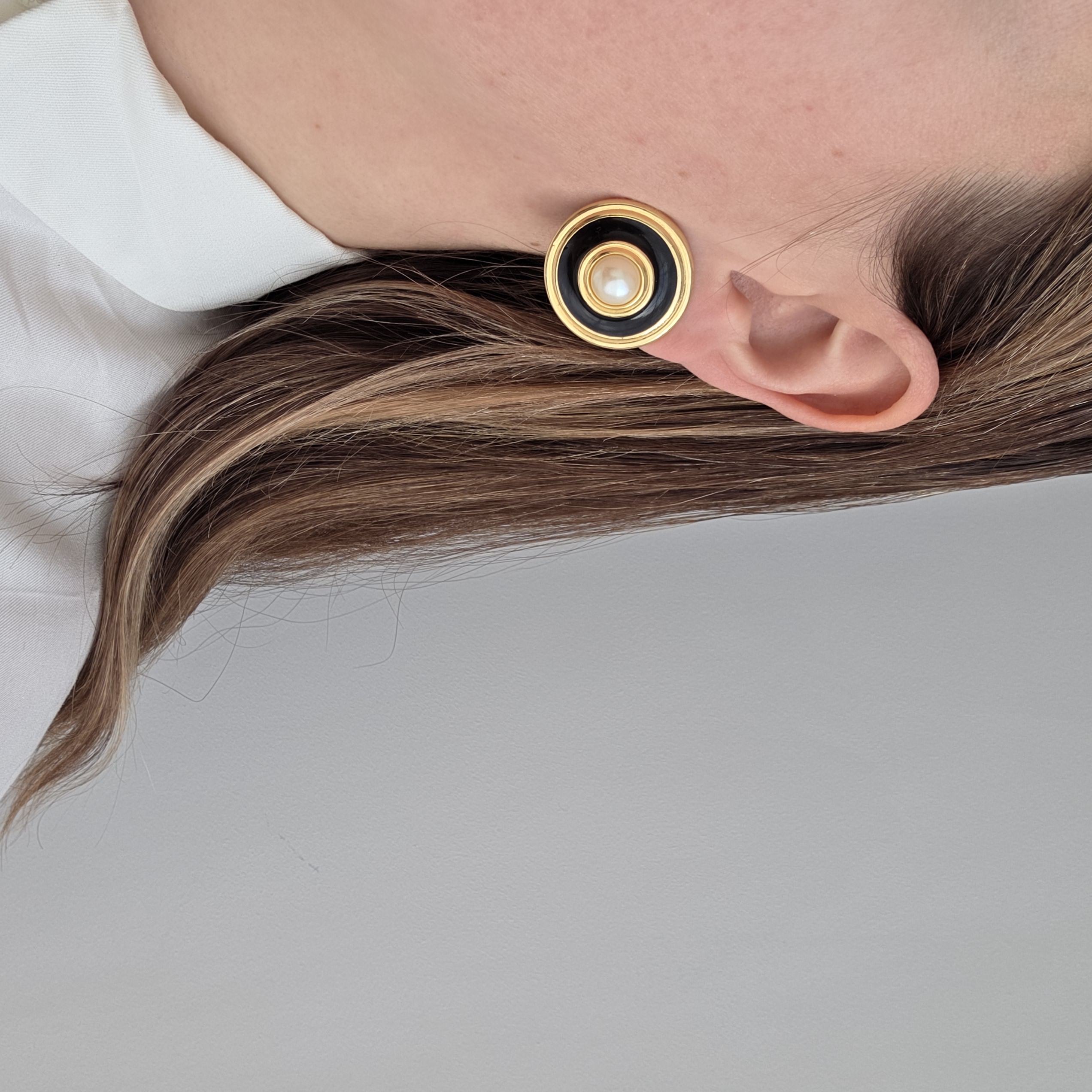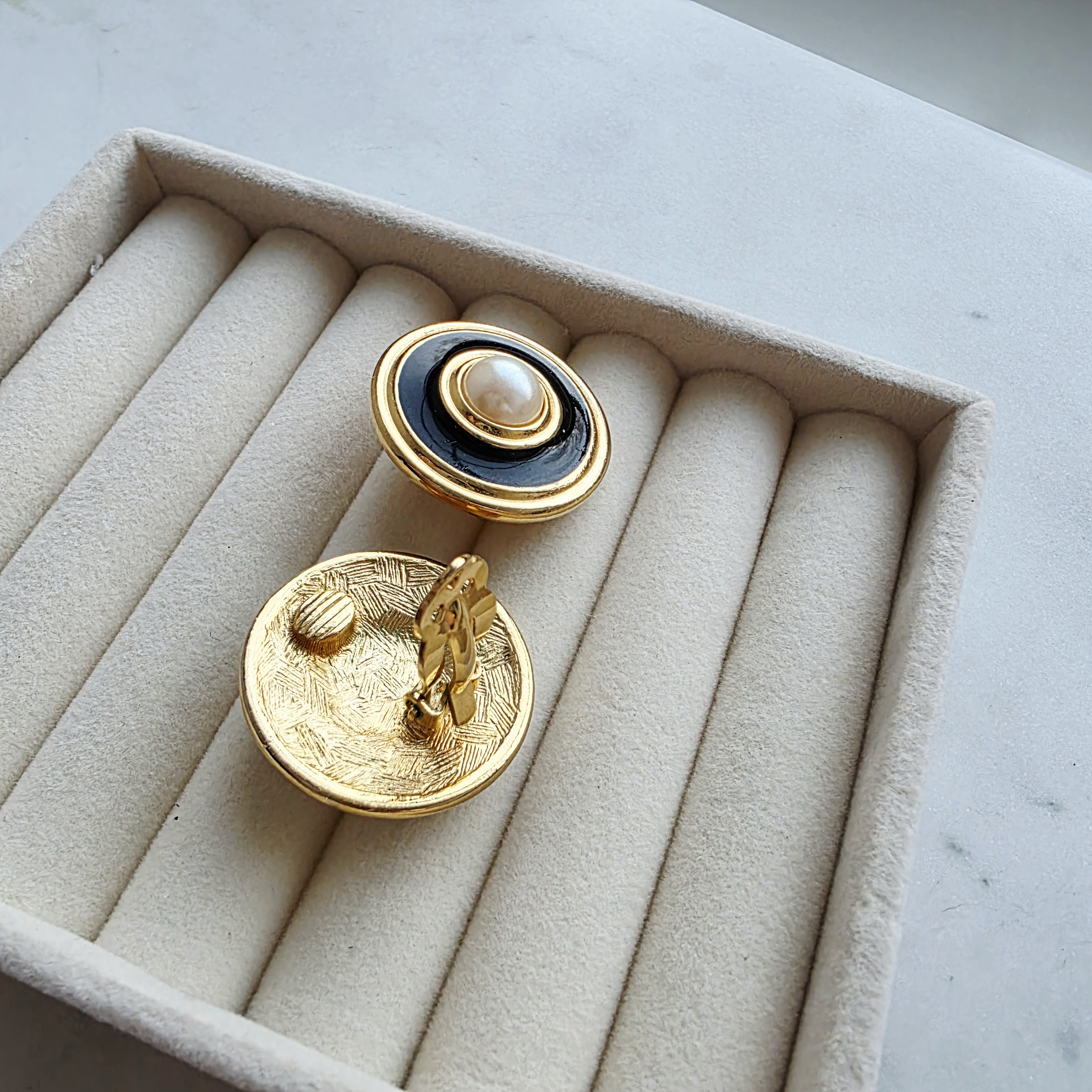 Шикарные клипсы круглой формы с небольшой вставкой искусственного жемчуга. Эти клипсы будут вечной классикой, парой, которая всегда уместна, ведь нет сочетания лучше, чем золото, жемчуг и чёрная эмаль